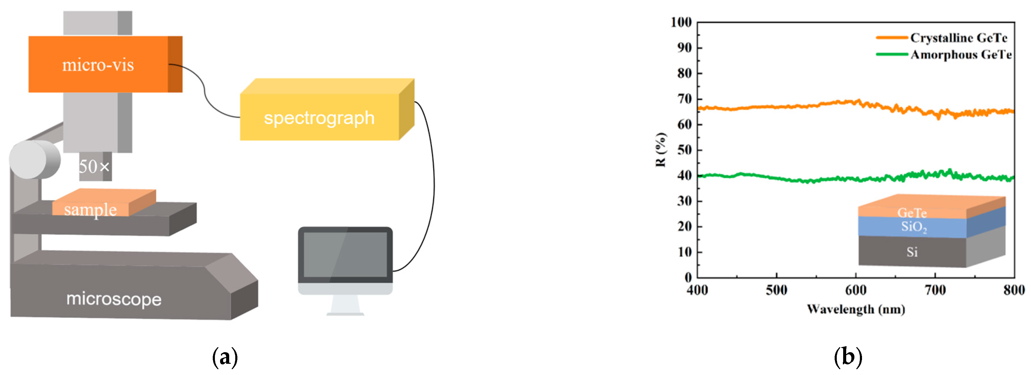 - Eliseev, N.; Kiselev, A.; Ionin, V.; Mikhalevsky, V.; Burtsev, A.; Pankov, M.; Karimov, D.; Lotin, A. Wide range optical and electrical contrast modulation by laser-induced phase transitions in GeTe thin films. Results Phys. 2020, 19, 103466. [Google Scholar] [CrossRef]