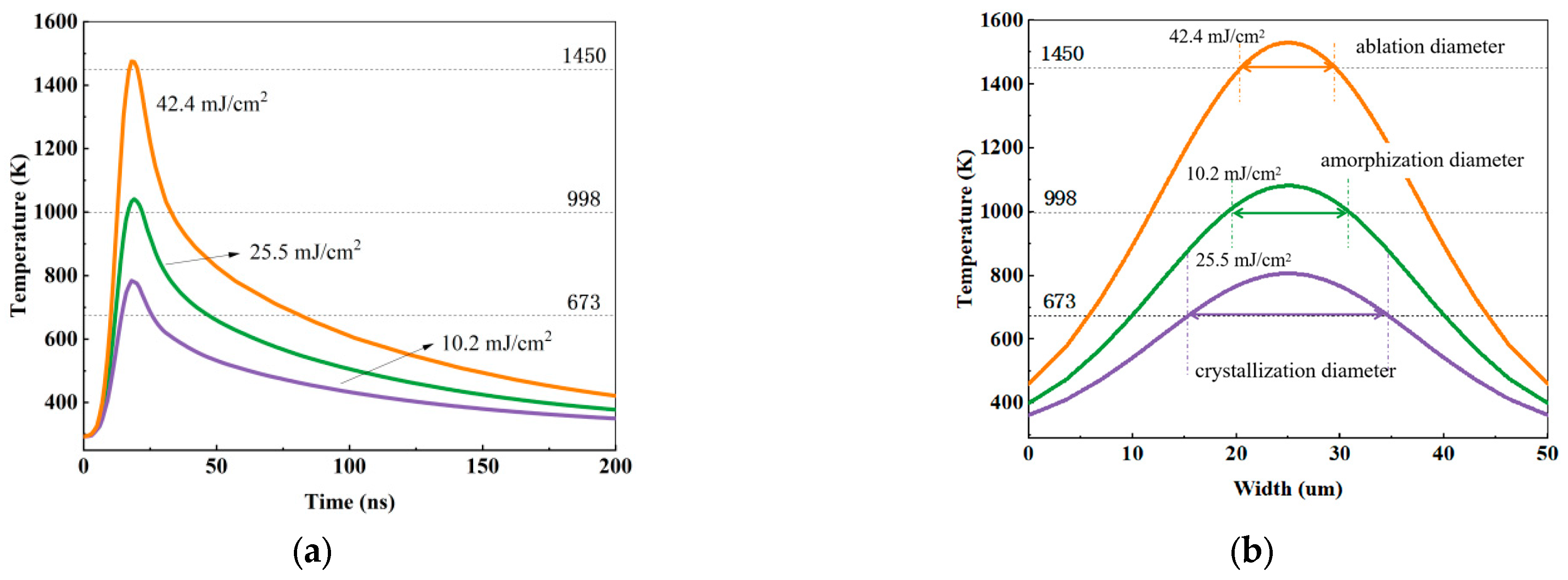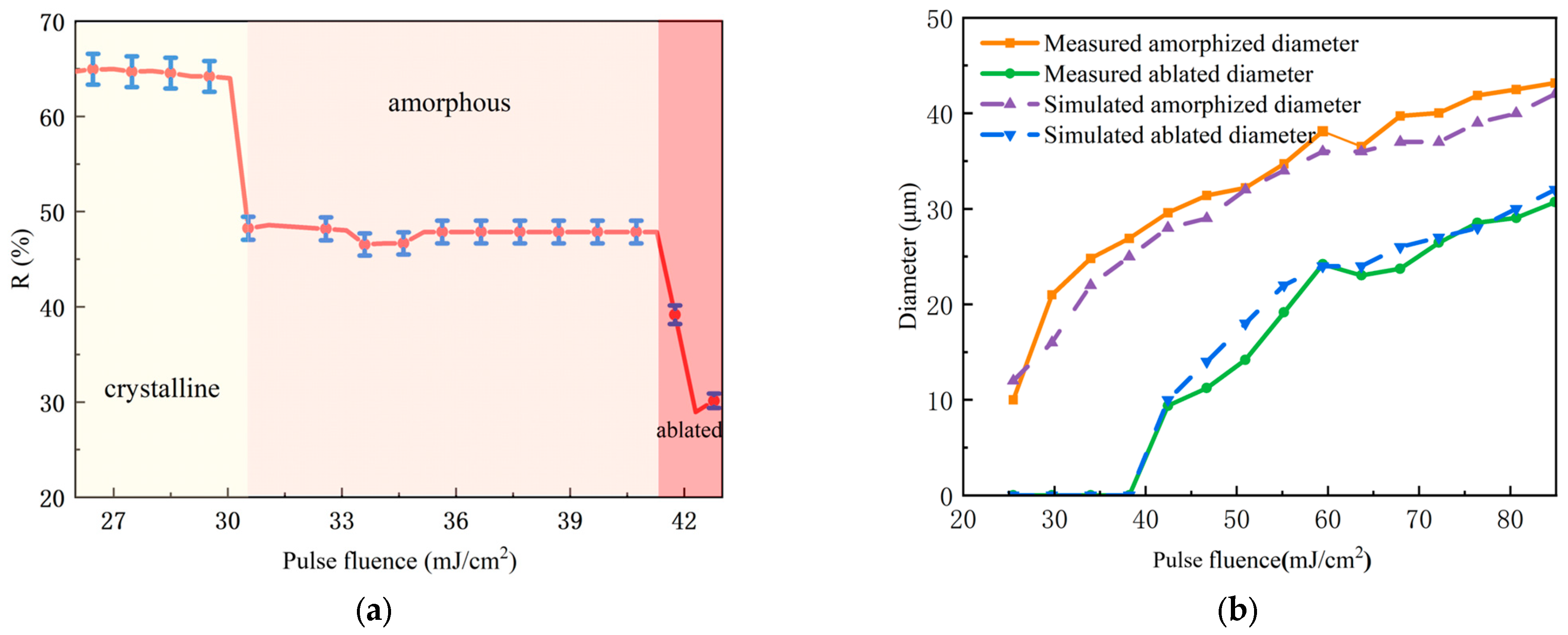 - The threshold fluences were quantitatively determined: recrystallization occurs at 8.5 mJ/cm2, while melt-quenching amorphization requires 25.4 mJ/cm2, consistent with coupled thermal–optical simulations and time-resolved reflectometry.