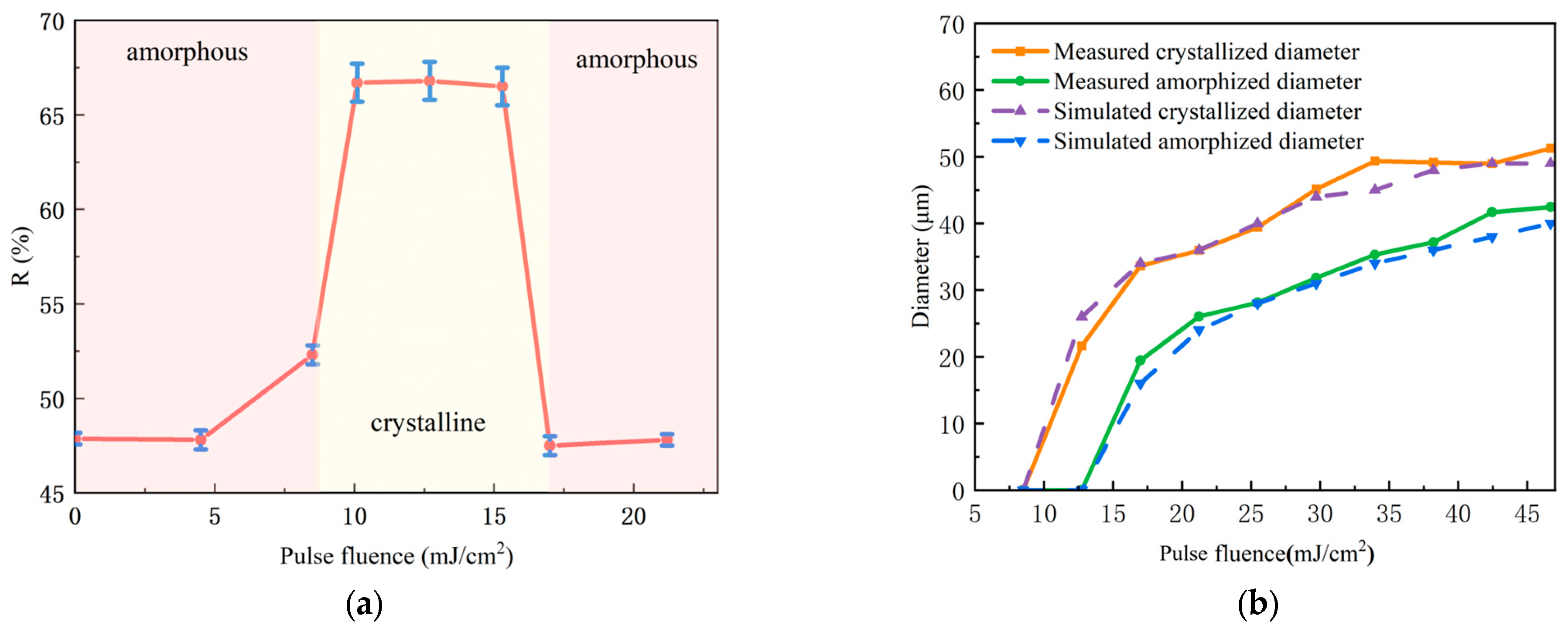 - Reamorphization state (>15 mJ/cm2): Further increasing fluence causes the central region temperature to exceed the amorphous threshold, leading to reamorphization, and the reflectivity level of GeTe film returns to amorphous state.