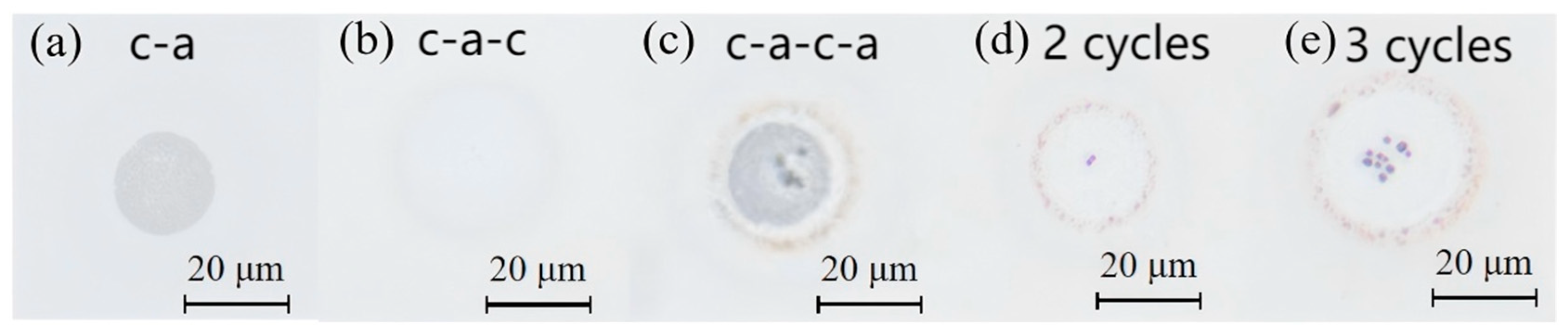 - Ablation stage (>41.28 mJ/cm2): The spot coverage approached 50 μm, with the expansion rate decreasing as ablation initiated (Figure 5c). Further increasing the fluence causes the central temperature to exceed the ablation threshold, leading to observable ablation. The resulting surface became populated with particulates, consequently enhancing diffuse scattering and reducing the measured reflectance to around 30%. Ultimately, at the highest fluences, the blue SiO2 substrate was exposed, confirming the complete ejection of GeTe from the central region.