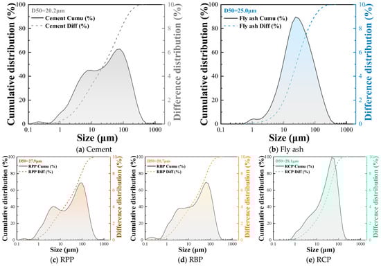 In this study, the particle sizes of cement, fly ash, and RP were measured. From the analysis presented in Figure 2, it can be seen that the particle sizes of cement, fly ash, and RP are mostly distributed below 120 μm. Among them, the particle size distributions of cement and RBP are similar, with median diameters (D50) of 20.2 μm and 20.7 μm, respectively, indicating relatively high fineness for these two materials. In contrast, RPP and RCP have larger particle sizes, with median diameters (D50) of approximately 28.0 μm. The larger particle sizes of these materials may only serve a skeletal role in cement-based materials, leading to poorer cohesion and potentially negatively impacting the mechanical properties of the products.