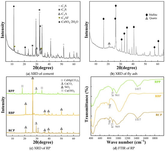 Furthermore, the chemical properties of cement, fly ash, and the three different types of RP were analyzed through, using a D8-Advance model from Bruker-AXS (Karlsruhe, Germany), and FTIR, using a Spectrum Two model from PerkinElmer (Shelton, CT, USA). As shown in Figure 3a, cement primarily consists of C3S, C2S, C3A, and C4AF, while the mineral composition of fly ash is predominantly made up of mullite and quartz. A distinct “bump peak” appears in the diffraction pattern between 20–30°, which is attributed to the presence of an amorphous phase—one of the key contributors to its reactivity [28]. RPP contains various hydration products, including Ca(OH)2, SiO2, and CaCO3. The main component of RBP is SiO2, with relatively strong diffraction peaks, indicating a high SiO2 content within the material. RCP consists of SiO2, CaCO3, and CaMg(CO3)2, with the presence of CaMg(CO3)2 likely originating from the coarse aggregates in the construction waste.