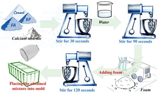 Figure 4 illustrates the preparation process of foam concrete. First, the cement, fly ash, RP, and calcium stearate are added to the mixing bowl according to the mix ratio presented in Table 1, and pre-mixed for 30 s. Then, water is added, and the mixture is stirred for approximately 90 s. The pre-prepared foam is quickly transferred to the mixing bowl, and stirring continues for an additional 120 s. Finally, the resulting slurry is poured into molds to form specimens, which are then covered with a plastic film and cured at room temperature for 24 h. Afterward, the specimens are demolded and transferred to a standard curing room (temperature: 20 ± 2 °C, humidity: ≥95%) for further curing until the designated test age is reached.