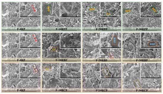 Additionally, unreacted fly ash particles are observed dispersed throughout the matrix, indicating that it has low reactivity and primarily acts as a filler, rather than directly participating in the hydration reaction. Further observation reveals that the particles of the three different types of RP are encapsulated by hydration products, with a significant amount of flocculent C–S–H gel surrounding RBP particles, indicating that RBP plays an effective microaggregate filling role within the cement matrix [34].