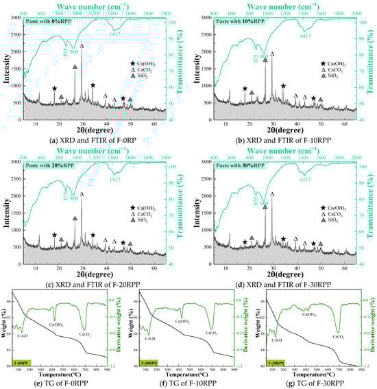 TG analysis is a quantitative analytical method, and in this study, it was used to further investigate the hydration products of the matrix, as shown in Figure 6c–e. The TG curves exhibit three distinct absorption peaks, located near 100 °C, 450 °C, and 700 °C. The absorption peak around 100 °C corresponds to the dehydration of C–S–H gel, the peak near 450 °C represents the decomposition of Ca(OH)2, and the peak near 700 °C is associated with the decomposition of CaCO3 [35,36]. Notably, the changes in the area of the CaCO3 absorption peak for F-0RP, F-10RPP, and F-30RPP are minimal, indicating that the content of CaCO3 in the matrix remains relatively unchanged. In contrast, the area of the Ca(OH)2 absorption peak around 450 °C decreases gradually as the RPP substitution ratio increases, which is consistent with the XRD analysis results. Such behavior may be due to the reduction in cement content with increasing RPP substitution ratio, which leads to a decrease in the formation of hydration products. On the other hand, Ca(OH)2 reacts with the active SiO2 in RPP to form C–S–H gel, which further consumes Ca(OH)2 in the matrix [27,37].