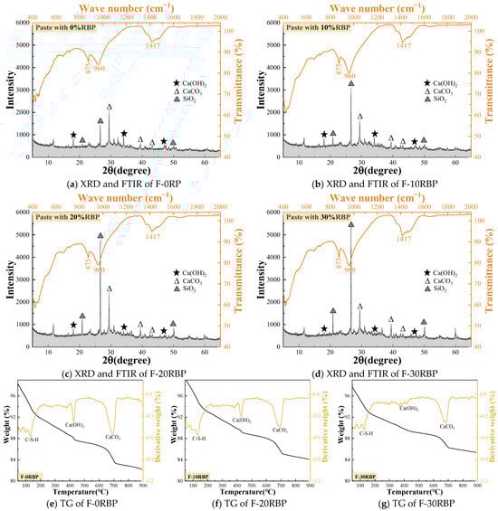 Figure 7a–d show the impact of RBP substitution ratios on the hydration products of the matrix. The results indicate that the hydration products are similar to those of the RPP group, primarily consisting of Ca(OH)2, CaCO3, and SiO2. As the RBP substitution ratio increases, the diffraction peak of Ca(OH)2 gradually decreases, while the diffraction peak of SiO2 increases. This suggests an increase in the SiO2 content in the matrix, primarily due to the incorporation of RBP, which is ground from sintered clay bricks and introduces a significant amount of SiO2. The test results of the raw materials in Figure 1 also support this conclusion. In the infrared spectrum, the absorption peak at 960 cm−1 corresponds to the formation of C–S–H gel, which is further confirmed by the TG analysis. The TG curve shows a distinct absorption peak around 100 °C, indicating the presence of C–S–H gel. Meanwhile, the absorption peak around 450 °C corresponds to the formation of Ca(OH)2, and as the RBP substitution ratio increases, the Ca(OH)2 absorption peak gradually diminishes. This trend is consistent with the XRD analysis results, suggesting that the incorporation of RBP may reduce the degree of hydration of the matrix, thus affecting the formation of hydration products.