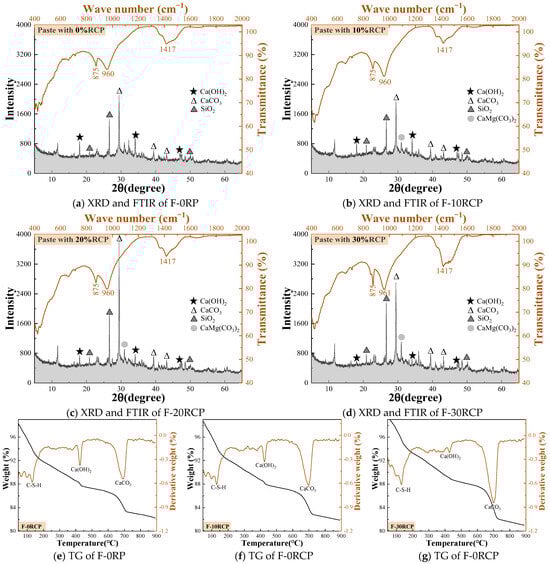 Figure 8 shows the influence of RCP substitution rates on the hydration products of the matrix. Unlike the hydration products of the recycled paste powder and recycled brick powder groups, the incorporation of RCP results in the appearance of a diffraction peak for CaMg(CO3)2 in addition to the common Ca(OH)2, CaCO3, and SiO2. As the RCP substitution ratio increases, the intensity of this diffraction peak gradually increases, indicating a higher content of CaMg(CO3)2 in the matrix. This phenomenon is primarily due to the presence of dolomite in RCP [38], and since dolomite is difficult to participate in the hydration reaction in the cement matrix, the content of CaMg(CO3)2 in the matrix increases. Meanwhile, as RCP is incorporated, the diffraction peak of Ca(OH)2 in the matrix weakens, while the diffraction peaks of CaCO3 and SiO2 intensify. This change can be attributed to the high content of quartz and calcite in RCP. Furthermore, the absorption peak at 1417 cm−1 in the infrared spectrum increases in area with the addition of RCP, further indicating an increase in CaCO3 content. The TG analysis also shows that the absorption peak around 700 °C gradually increases in area, further confirming the increase in CaCO3 content, consistent with the XRD and FTIR results.