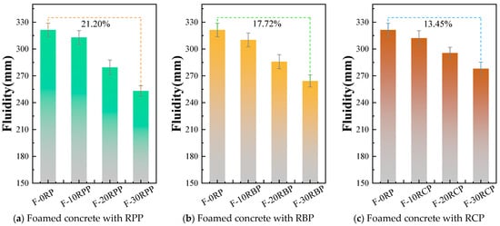 - Different types of RP have a negative impact on the flowability and mechanical properties of foam concrete. With the increase in the RP substitution ratio, the compressive strength of the foam concrete gradually decreases. The decline in mechanical properties is particularly significant when the RP substitution ratio reaches 30%. However, at the same substitution ratio, the recycled brick powder group shows better compressive strength. For example, the 28 d compressive strength of F-30RBP is 28.61% and 39.20% higher than that of F-30RPP and F-30RCP, respectively.