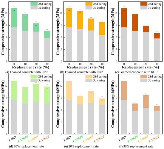 As the substitution ratio of the three types of RP increases, the compressive strength of foam concrete at 3 d and 28 d shows a gradual decrease, with the reduction in compressive strength at 28 d being more significant than at 3 d. Such as, after 3 d of curing, the compressive strength of F-10RPP, F-20RPP, and F-30RPP decreased by 9.64%, 12.57%, and 31.26%, respectively, compared to F-0RP; the compressive strength of F-10RBP, F-20RBP, and F-30RBP decreased by 4.82%, 9.05%, and 22.56%, respectively, compared to F-0RP; and the compressive strength of F-10RCP, F-20RCP, and F-30RCP decreased by 10.34%, 13.40%, and 32.31%, respectively, compared to F-0RP. When the curing age reaches 28 d, the compressive strength of F-10RPP, F-20RPP, and F-30RPP decreases by 11.10%, 28.32%, and 42.45%, respectively, compared to F-0RP; the compressive strength of F-10RBP, F-20RBP, and F-30RBP decreases by 5.59%, 19.56%, and 25.98%, respectively, compared to F-0RP; and the compressive strength of F-10RCP, F-20RCP, and F-30RCP decreases by 10.88%, 33.16%, and 46.83%, respectively, compared to F-0RP.