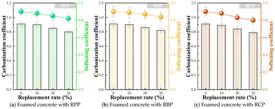 - As the substitution ratio of the three types of RP increases, both the carbonation coefficient and the softening coefficient of RPFC show a decreasing trend. Furthermore, the incorporation of RP has a minimal effect on the thermal conductivity of RPFC, indicating its good applicability in foam concrete.