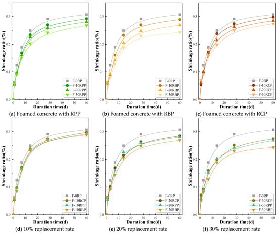 Due to its high porosity, foam concrete exhibits greater shrinkage compared to ordinary concrete. Therefore, this section explores the impact of different types and substitution ratios of RP on the drying shrinkage of foam concrete. First, the specimens were placed in a constant-temperature water bath at (20 ± 2) °C. After 72 h, they were removed from the water and the surface was wiped clean. The initial length of the foam concrete specimens was measured using a length comparator. The specimens were then placed in a drying shrinkage chamber with a temperature of (20 ± 2) °C and relative humidity of (60 ± 5)%. The length changes in the specimens were measured at 1, 3, 7, 14, 28, and 60 d. The drying shrinkage rate was calculated based on these measurements, and the results are shown in Figure 12. The findings show that the drying shrinkage rate of RPFC rises quickly at first, before stabilizing over time. During the first 28 d of testing, the drying shrinkage of RPFC increases quickly. For example, the 28 d drying shrinkage rates of F-0RP, F-10RPP, F-20RPP, and F-30RPP reached 94.79%, 92.47%, 92.17%, and 90.30% of their maximum values, respectively; the 28 d drying shrinkage rates of F-10RBP, F-20RBP, and F-30RBP reached 93.43%, 92.19%, and 94.65%, respectively; and the 28 d drying shrinkage rates of F-10RCP, F-20RCP, and F-30RCP reached 91.95%, 92.28%, and 91.61%, respectively. However, as the testing period increased, the drying shrinkage rate of RPFC significantly slowed down and stabilized.