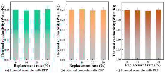 Figure 13 presents the thermal conductivity of RPFC. The results indicate that the thermal conductivity of foam concrete changes only slightly with the incorporation of different types of RP. For example, the thermal conductivity of F-0RP, F-10RPP, F-20RPP, and F-30RPP were 0.251 W/(m·K), 0.246 W/(m·K), 0.250 W/(m·K), and 0.255 W/(m·K), respectively; the thermal conductivity of F-10RBP, F-20RBP, and F-30RBP were 0.255 W/(m·K), 0.247 W/(m·K), and 0.250 W/(m·K); the thermal conductivity of F-10RCP, F-20RCP, and F-30RCP were 0.249 W/(m·K), 0.247 W/(m·K), and 0.253 W/(m·K), respectively. The above results indicate that the incorporation of RP did not significantly affect the thermal conductivity of foam concrete, suggesting that different types of RP are well-suited for use in foam concrete without compromising its thermal insulation performance. This provides strong support for the application of foam concrete in building insulation.