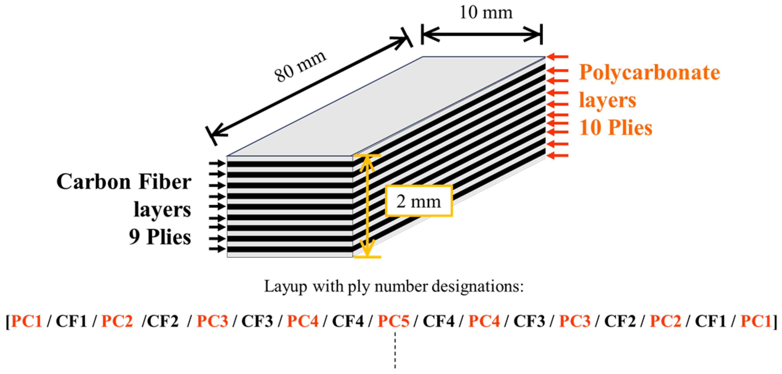 The CFRPC (the 55.3 vol% CF) samples were prepared in Formosa (TAIRYFIL [FTC:EC3C], Formosa Plastics Co., Formosa, Kaohsiung City, Taiwan), with sized plain cross-weave CF plies (TR3110M, Mitsubishi Rayon Ltd., Tokyo, Japan) 230 µm in thickness prior to molding. Areal weight of CF was 198 to 200 gm−2 [83]. TP PC sheets (110 mm × 170 mm × ~286 µm) (Sugawara Kougei Ltd., Tokyo, Japan) were fabricated by hot-pressing PC particles (3 g) under 15 MPa at 418 Kfor 3 min. As illustrated in Figure 1, specimens were assembled as 9 CF plies alternating between 10 PC sheets (19 plies total), designated “[PC]10[CF]9”, then hot-pressed at 2.45 MPa at 508 K for 15 min. Sample dimensions were cut into 10 × 2.0 × 80 mm dimensions prior to HLEBI. It is assumed that after hot press, PC and CF layer thicknesses were 79 μm and 139 μm, respectively. As shown, outer plies going into the thickness from both sides will be designated as follows: “PC1”, “CF1”, “PC2”, and “CF2”. Samples were unnotched.