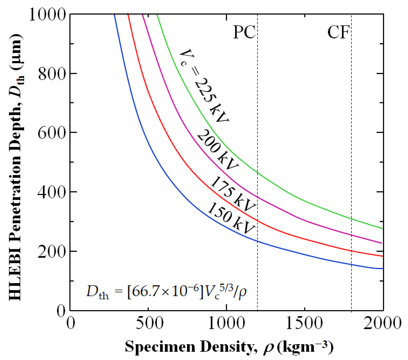 Figure 2 shows calculated plots of Dth vs. ρ [84] for Vc of 150, 175, 200, and 225 kV with vertical lines indicating ρ of PC and CF, whose intersections yield Dth values.