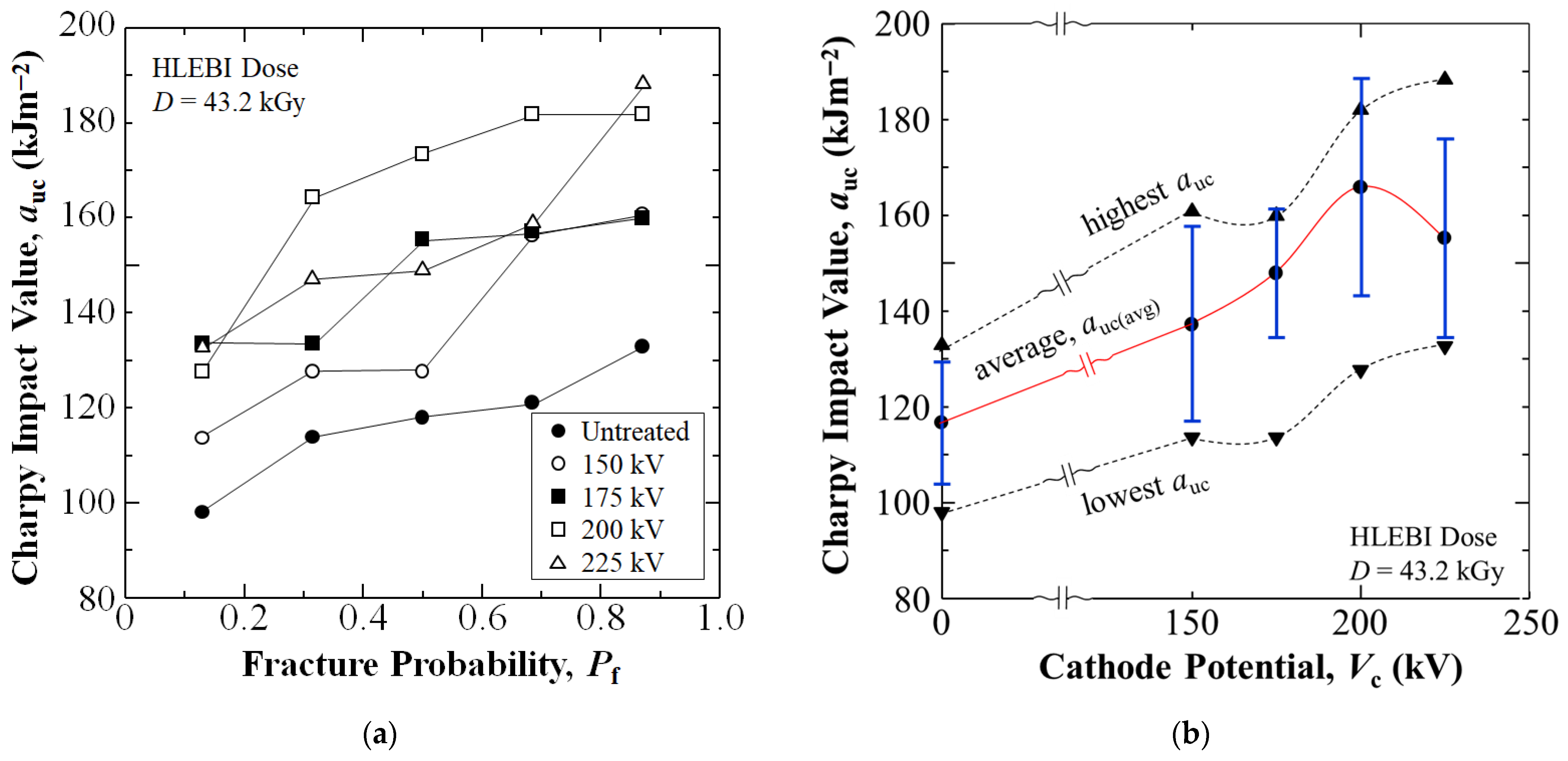 Figure 3a shows that when applying a 43.2 kGy HLEBI dose to [PC]10[CF]9 finished sample surfaces, the Vc setting of 200 kV increases Charpy impact value, auc (at median-Pf of 0.50), 47% over that of untreated, from 118 kJm−2 to 173 kJm−2. In addition, Figure 3a shows that increasingly higher Vc settings of 150, 175, and 200 kV successively increase auc at median-Pf of 0.50 from 118 kJm−2 for untreated to 128, 155, and 173 kJm−2, respectively. However, the higher 225 kV Vc setting results in a decrease in auc at Pf of 0.50 to 149 kJm−2.
