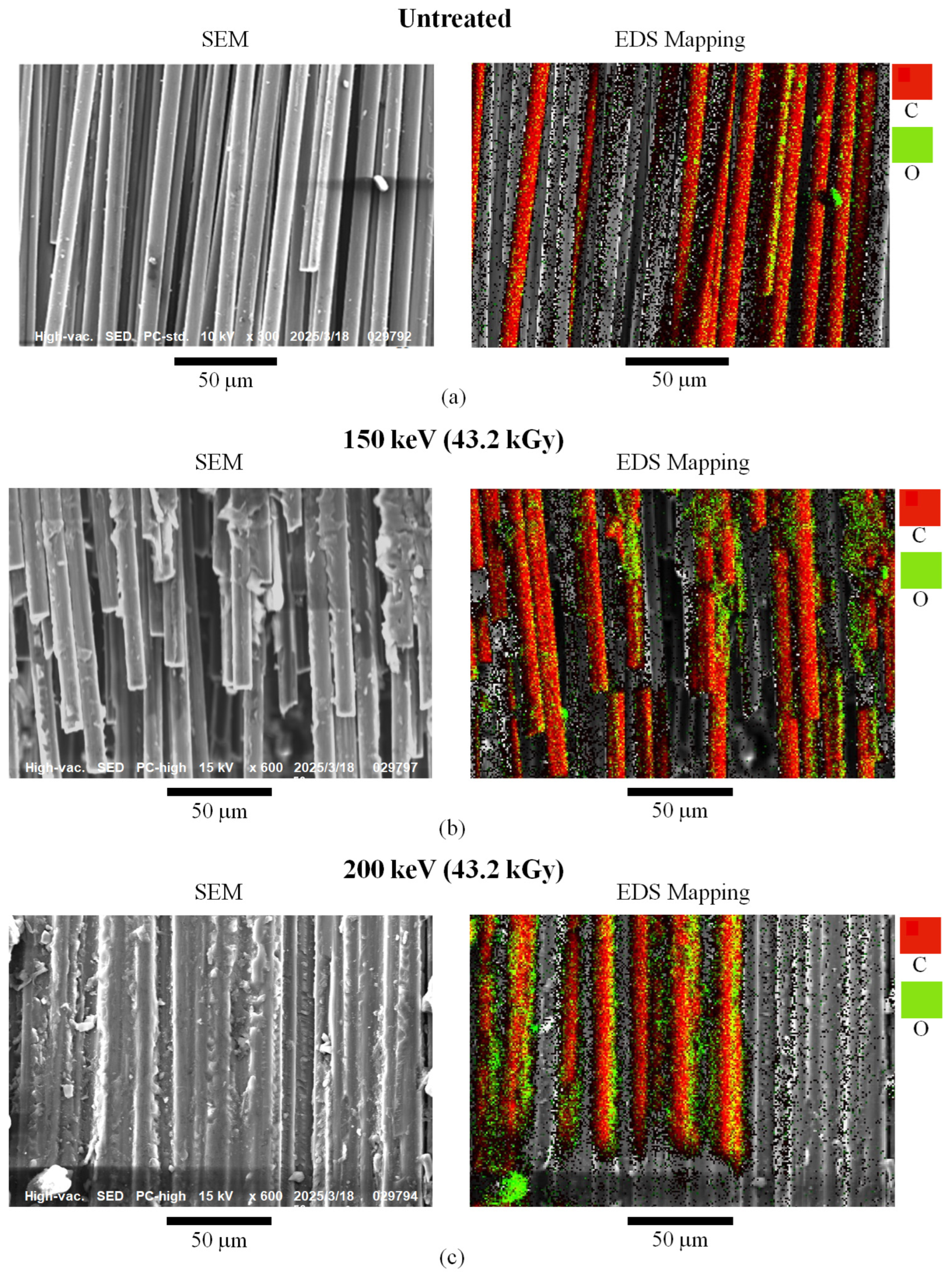 EDS mappings in Figure 4a–c (right side) show increased O atoms (green) from the PC bonding with CFs (C in red) from untreated to 150 kV, with the most at 200 kV. A reviewer suggested that elemental composition analysis be carried out, but Figure 4 clearly shows increased O atoms adhering to the HLEBI samples supporting enhanced adhesion. HLEBI activation does not change the overall C/O ratio in the samples and SEM observations already confirm that strong adhesion is achieved by HLEBI by surface and bonding interactions.