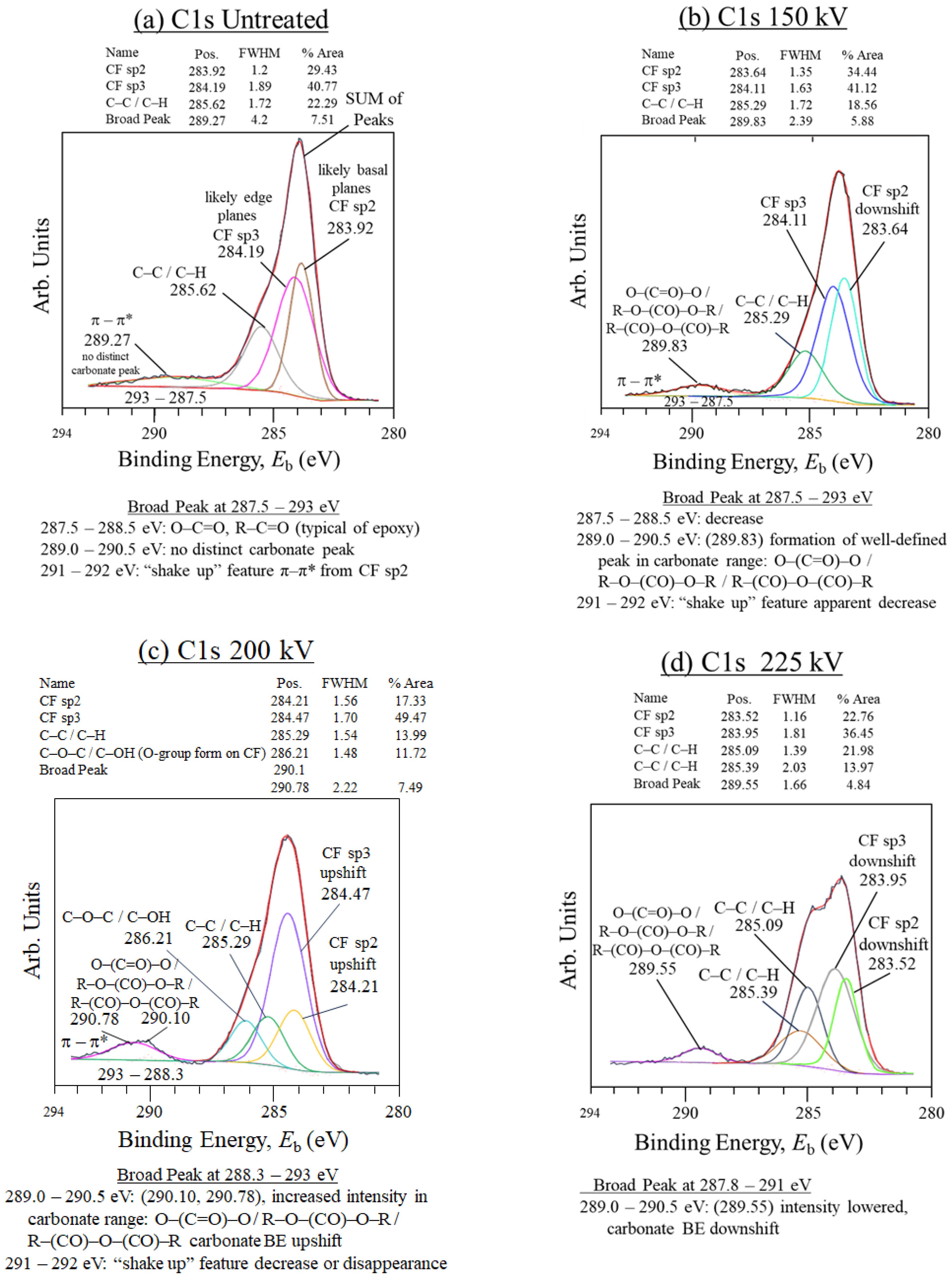 Figure 7. (ad) XPS C1s scans of CF in the specimen fracture area. “Downshift” and “upshift” refer to shift in BE of CF sp2 and sp3 as HLEBI Vc is increased.