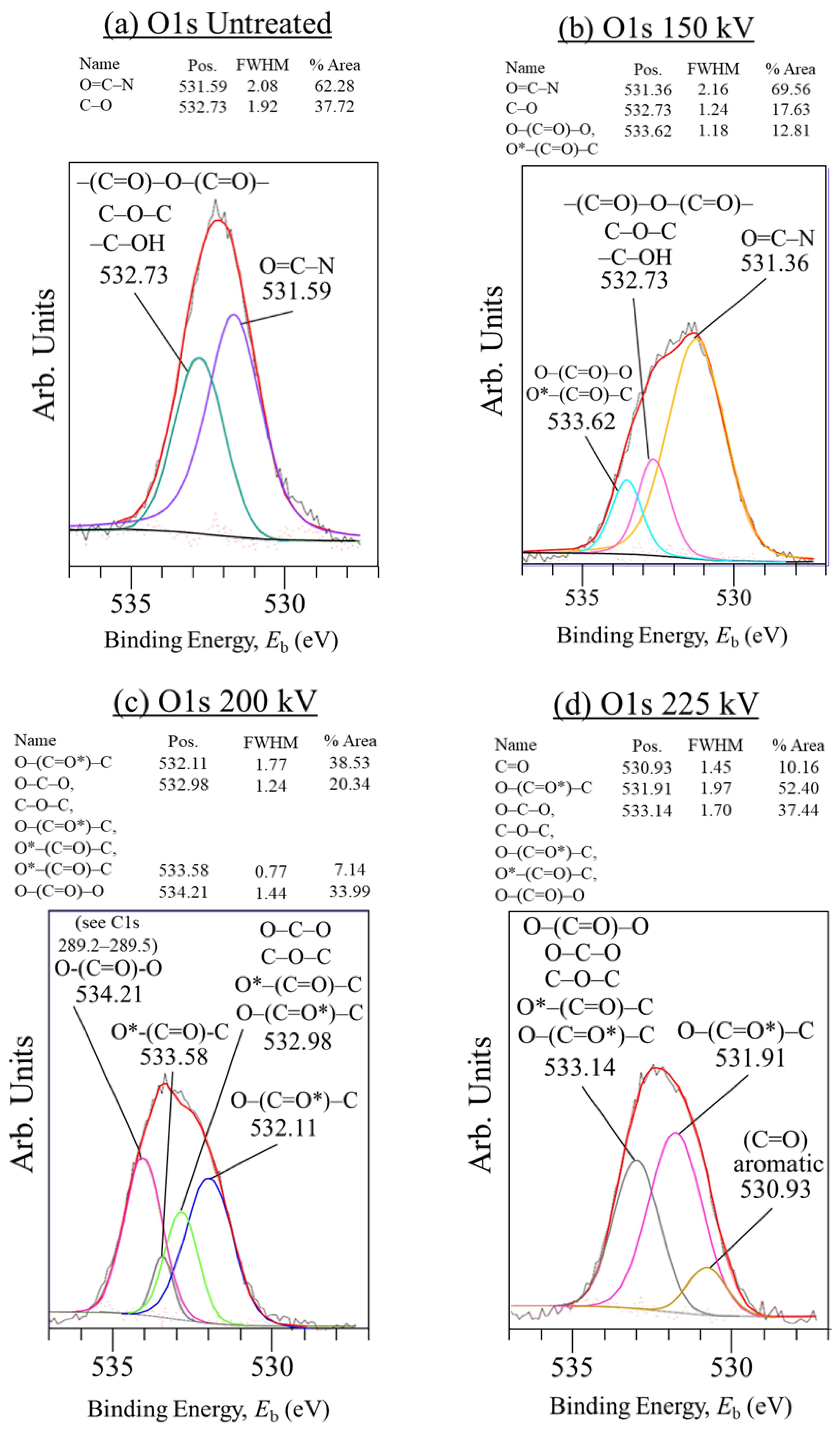 Figure 8. (ad) XPS O1s scans of CF in the specimen fracture area. Asterisks (*) designate XPS peak assignments.