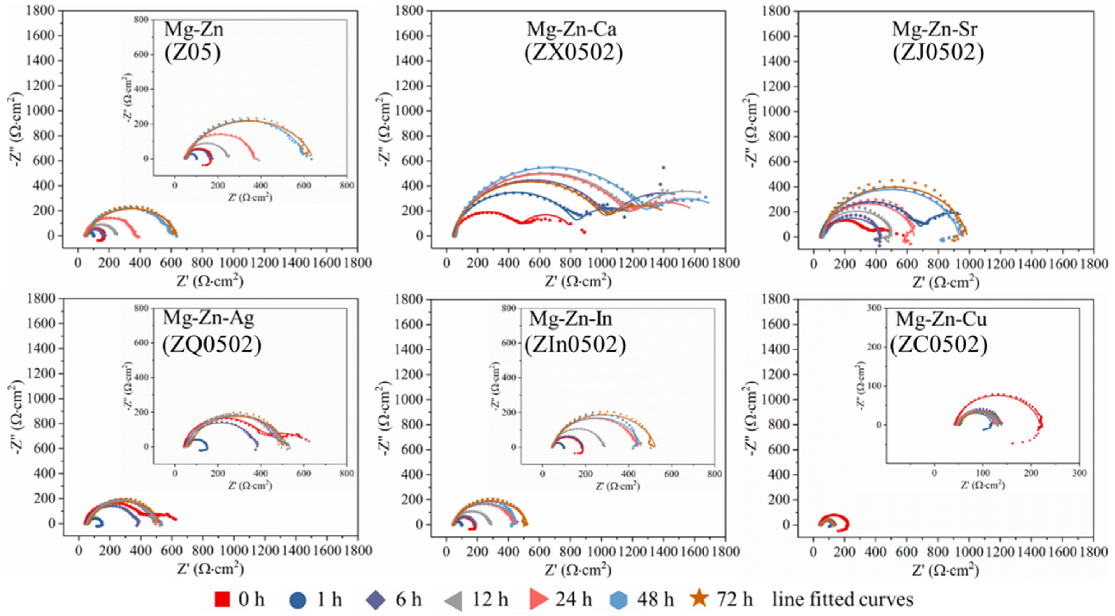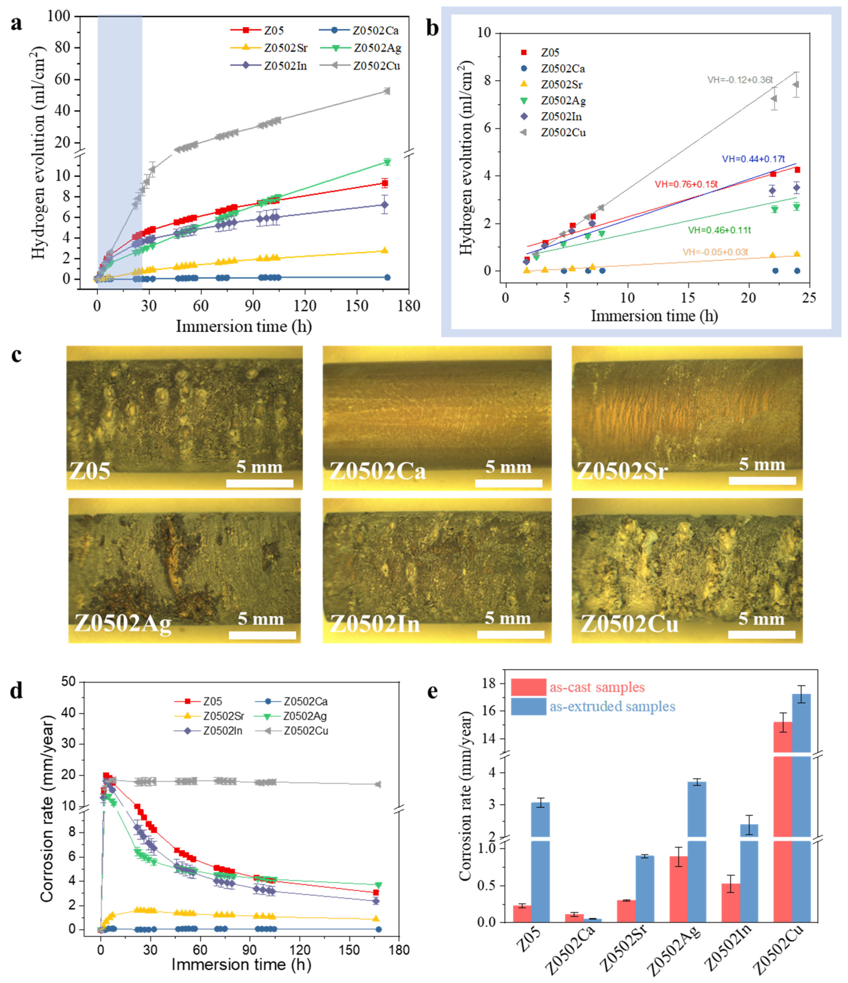 - The corrosion performances of as-extruded Z05, Z0502-Ag and Z0502-In deteriorate distinctly compared to the as-cast states due to the redistribution of Fe precipitates.