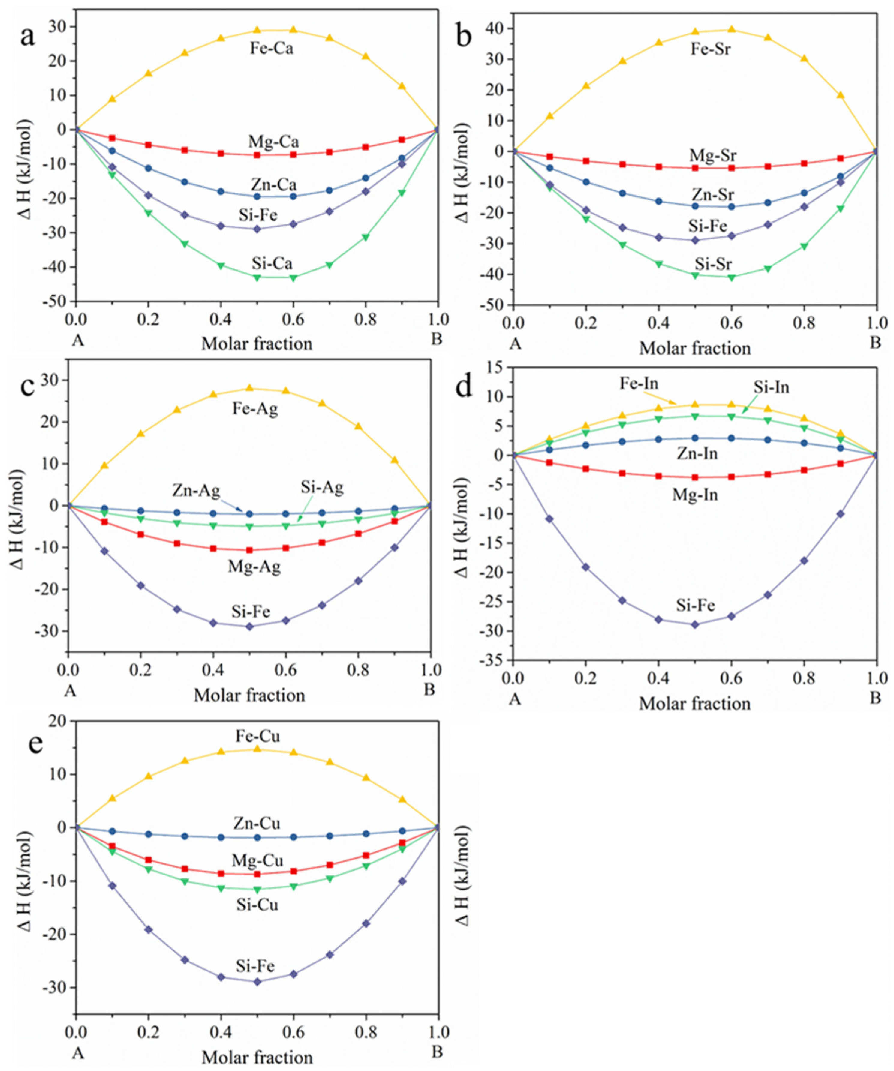 - The influence of Fe precipitation during hot processing is not that severe for Z0502-Ca and Z0502-Sr, mainly resulting from the lower ΔH of Ca-Si and Sr-Si compared to Fe-Si, and the appreciable ΔE of the MgCaSi and MgSrSi phases.