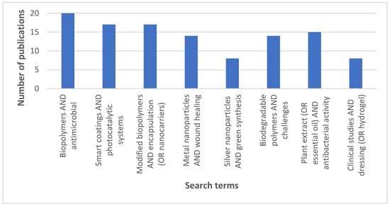 A literature search was performed in leading international scientific databases, including PubMed, Scopus, and Web of Science, covering publications from 2015 to 2025. A predefined set of keywords and logical operators (AND, OR) was applied to identify the most relevant studies on the development of antimicrobial biopolymer matrices. Key search terms included: biopolymer matrix, antimicrobial, metal nanoparticles, plant extract, smart coatings, photocatalytic systems, and their various combinations (Figure 2). Selection criteria focused on original research reporting experimental results, as well as review articles providing structured analyses of current trends and approaches.