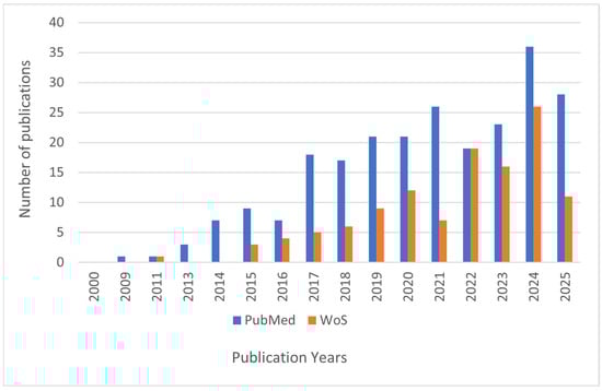 Publications indexed in PubMed demonstrate a steady increase starting around 2013, with a notable surge after 2017. Similarly, WoS publications show a consistent growth pattern, though in smaller absolute numbers compared to PubMed, indicating complementary but distinct indexing scopes.