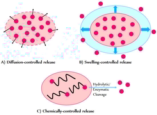 Schematic view of drug release mechanisms from hydrogels. (A) Diffusion-controlled release. (B) Swelling-controlled release. (C) Chemically controlled release [100]. Adapted from Ghasemiyeh, P. et al. Hydrogels as Drug Delivery Systems; Pros and Cons. Trends Pharm. Sci. Technol. 2019, 5, 7–24. © 2019, licensed under CC BY 4.0 (https://creativecommons.org/licenses/by/4.0/ accessed on 11 November 2025).