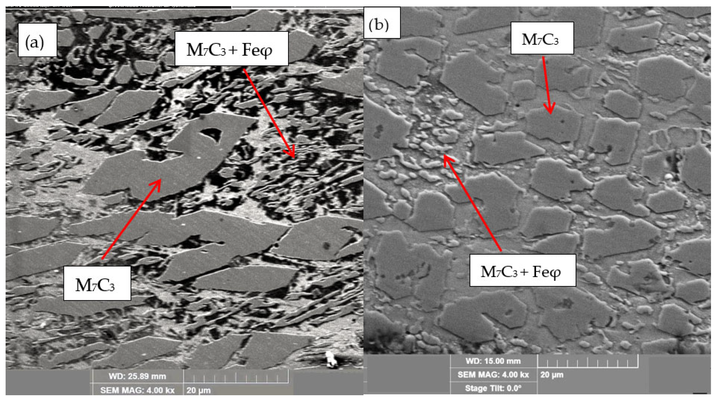 36] analyzed the interpretation of hardfacing deposits produced by welding using the liquidus surface in Fe-Cr-C ternary diagrams, where results similar to those presented here were obtained, predicting coatings rich in phases formed by primary M7C3 carbides in a eutectic-rich matrix consisting of γ-iron and small M7C3 carbides.