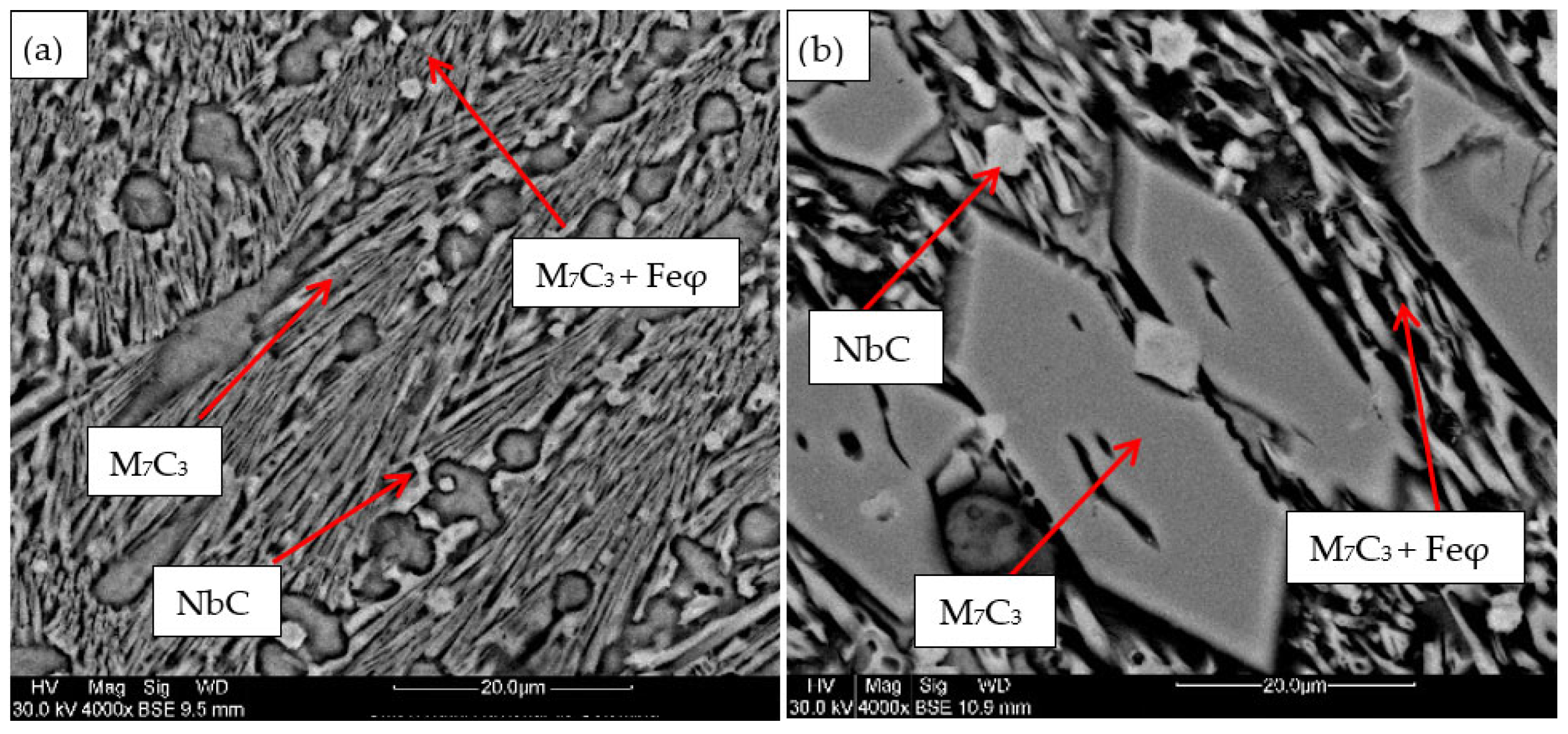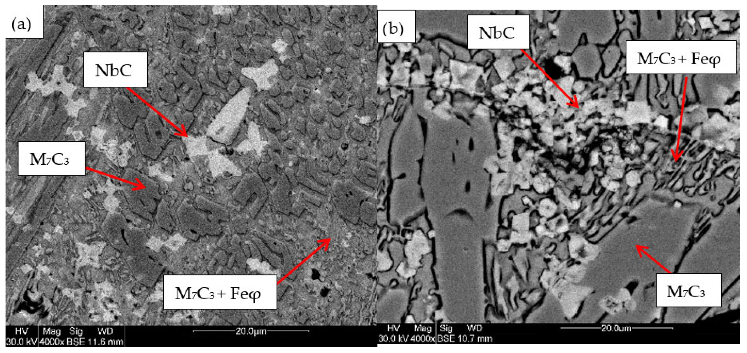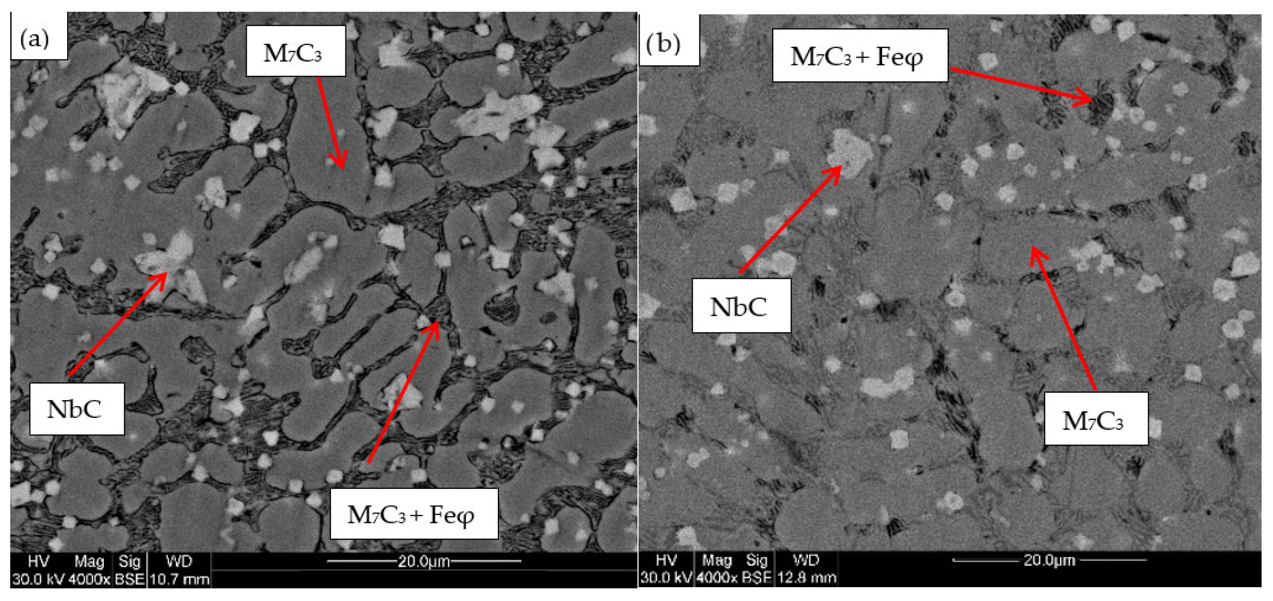 40], among others, who reported that additions and increases in niobium content led to increases in measured hardness values, mainly due to the initial formation of niobium carbides and their higher hardness compared to chromium carbides.