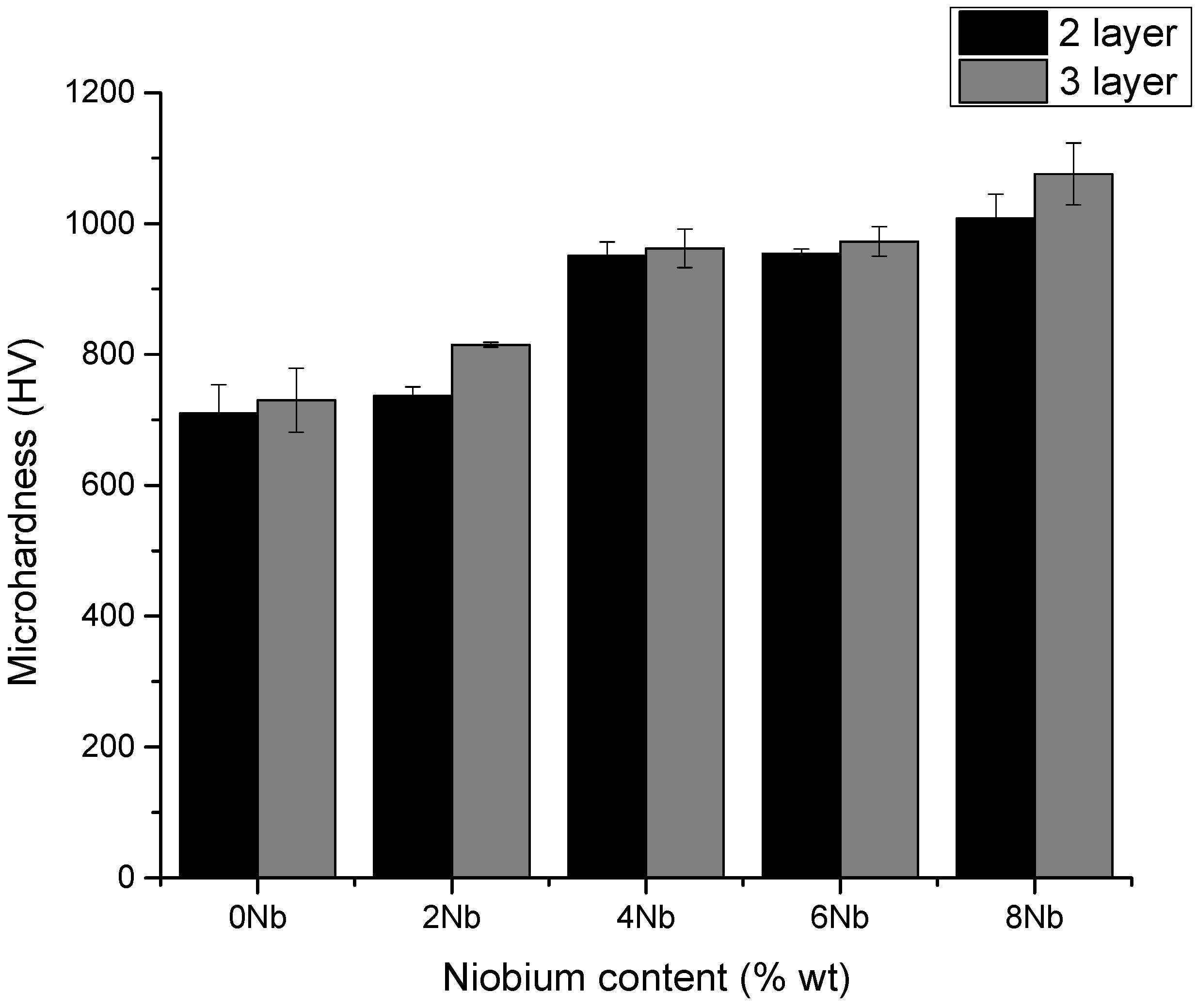 Across the tested range of niobium contents (0–8%), the coatings exhibited a progressive increase in microhardness. The baseline composition (0% Nb) showed the lowest hardness, governed primarily by chromium carbides. As niobium content increased from 2% to 8%, the formation of fine and hard niobium carbides intensified, leading to a steady and measurable rise in hardness. These results demonstrate that controlled Nb additions within this range effectively refine the microstructure and enhance the mechanical performance of the hardfacing coatings.