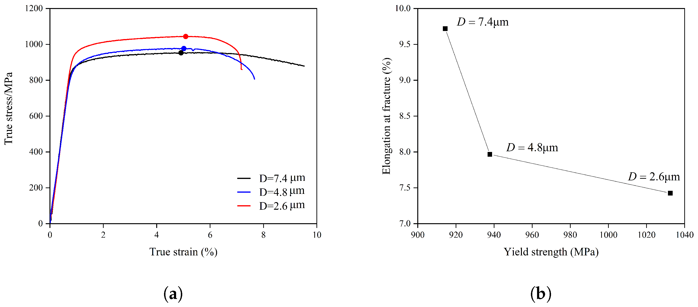 Figure 1. (a) Experimental uniaxial tensile true stress–strain curves, with solid circles marking the ultimate tensile strength points. (b) Yield strength versus elongation at fracture for different grain sizes.