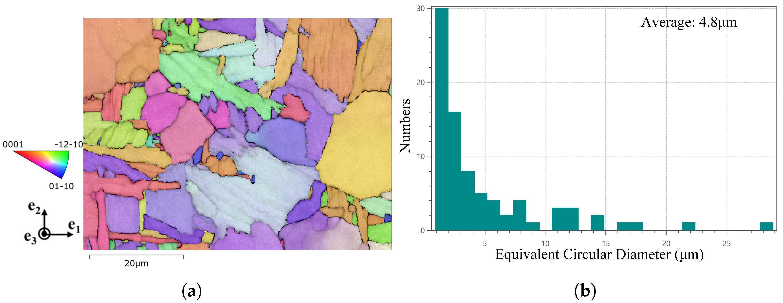 Figure 2. Microstructural of TC4 samples: (a) inverse pole figure map and phase distribution determined from electron backscatter diffraction, and (b) statistical distribution of equivalent circular diameter for the α -phase grains.
