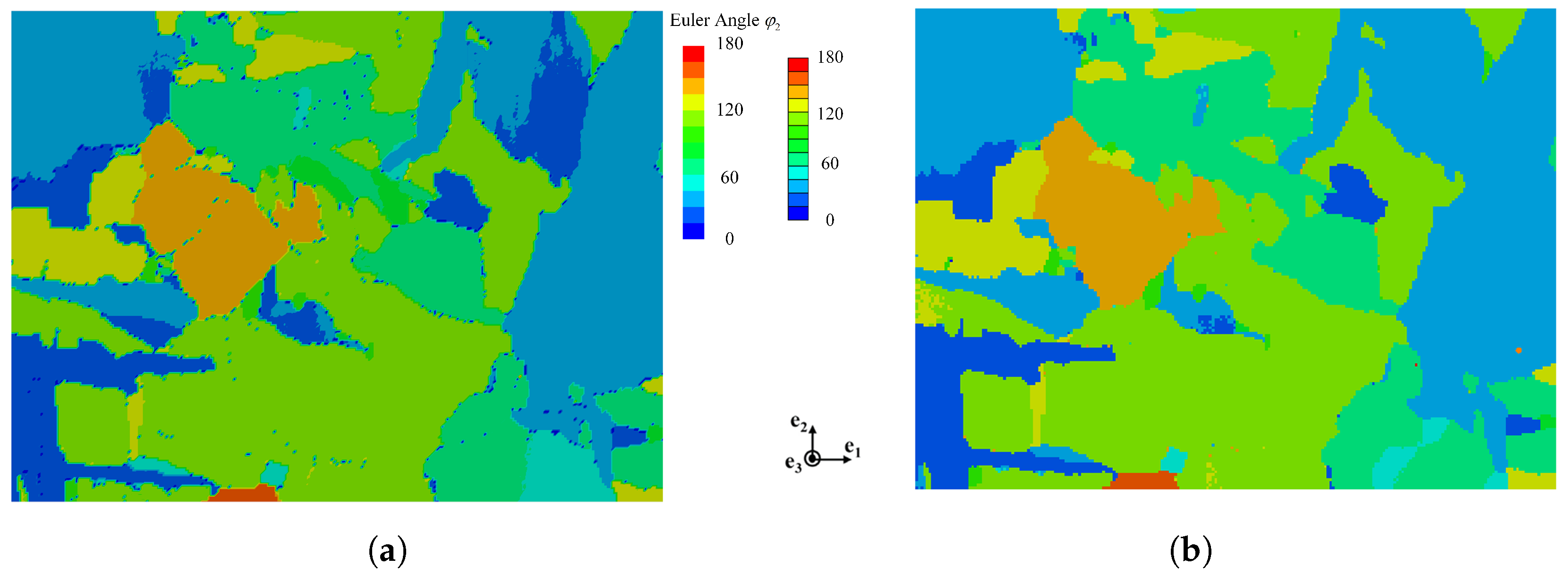 Finite-element representative volume element (RVE) models of the microstructure were constructed based on the EBSD (Figure 3a), as shown in Figure 3b. The RVE model applies the grain orientations from the EBSD data for modeling and subsequent calculations.The EBSD-derived microstructure was reconstructed as an RVE with single-element discretization in the out-of-plane direction, maintaining full crystallographic orientation data while enabling efficient computation. In the simulated tests discussed later, the load is applied in the e 2 direction. The Euler angle ϕ 2 represents the final rotation about the crystal’s c-axis. The model employs 43,200 hexahedral elements (C3D8 type), containing 120 grains.