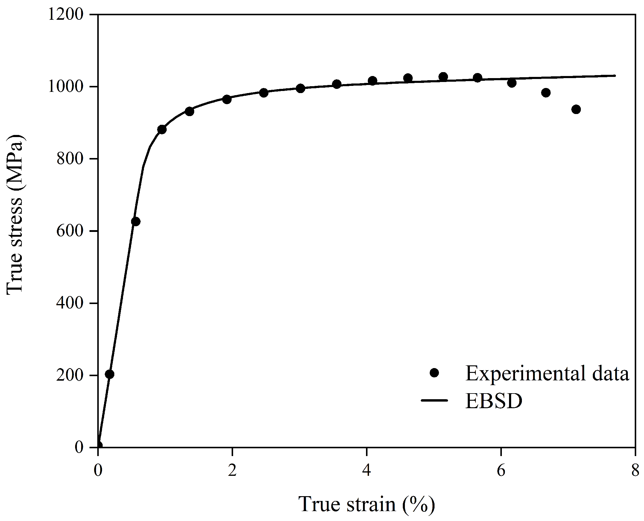 Figure 4. Validation of the crystal plasticity model against experimental data for the sample with an average grain size of 4.8 µm: Comparison between the experimental tensile curve and the simulation results from the EBSD-based representative volume element (RVE) model.