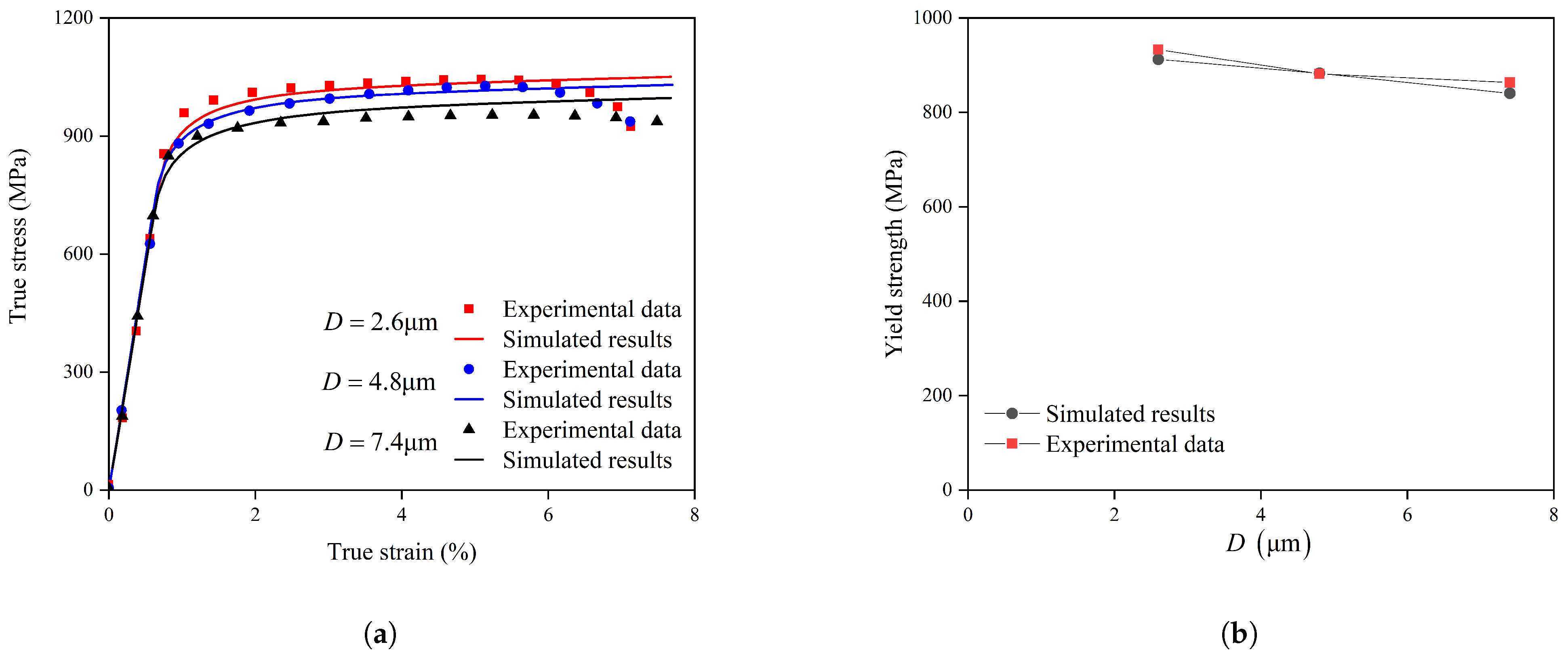 Figure 5. Mechanical response of TC4 alloy with varying grain sizes: (a) experimental and simulated true stress–strain curves, and (b) Comparison of yield strength between experiments and model predictions as a function of grain size.