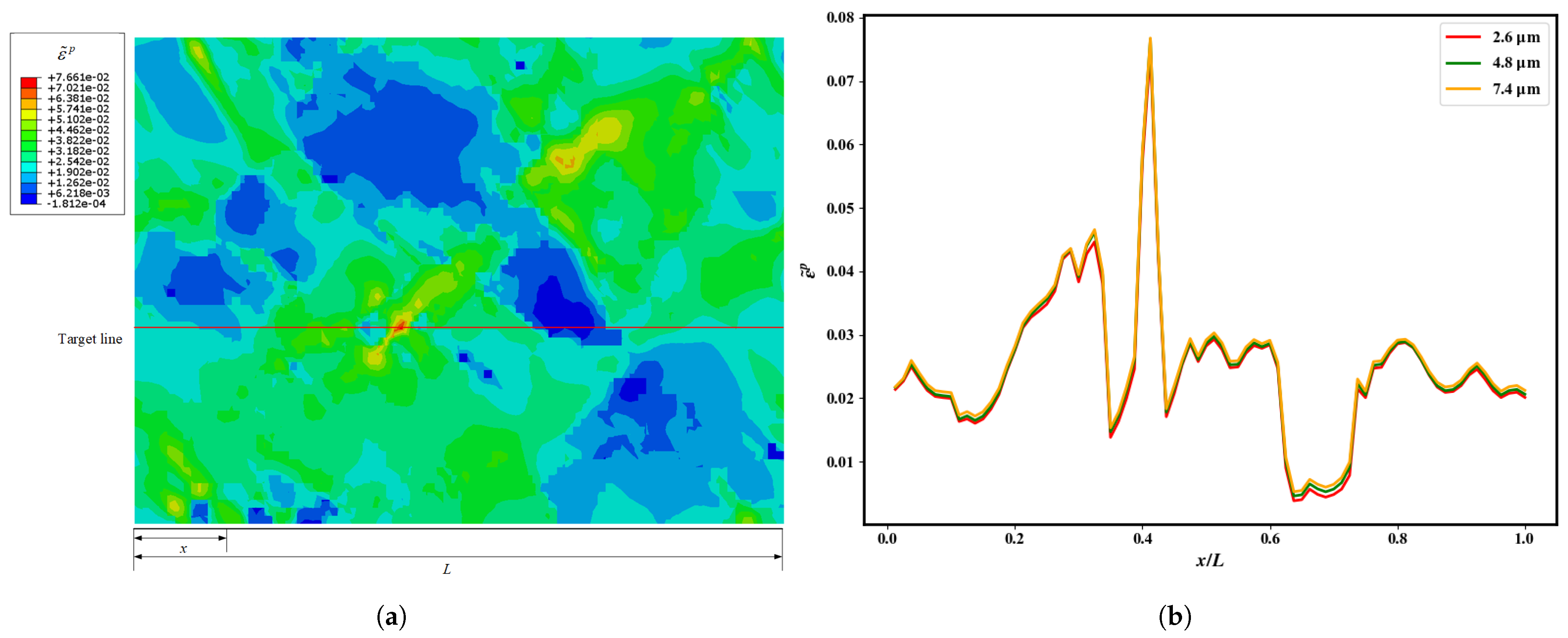 Figure 6. (a) Full field distribution of accumulated equivalent plastic strain (PEEQ) at yield across the entire RVE (D = 4.8 µm). (b) Local PEEQ values along a target line for different grain sizes, showing the effect of grain size on local strain concentration.