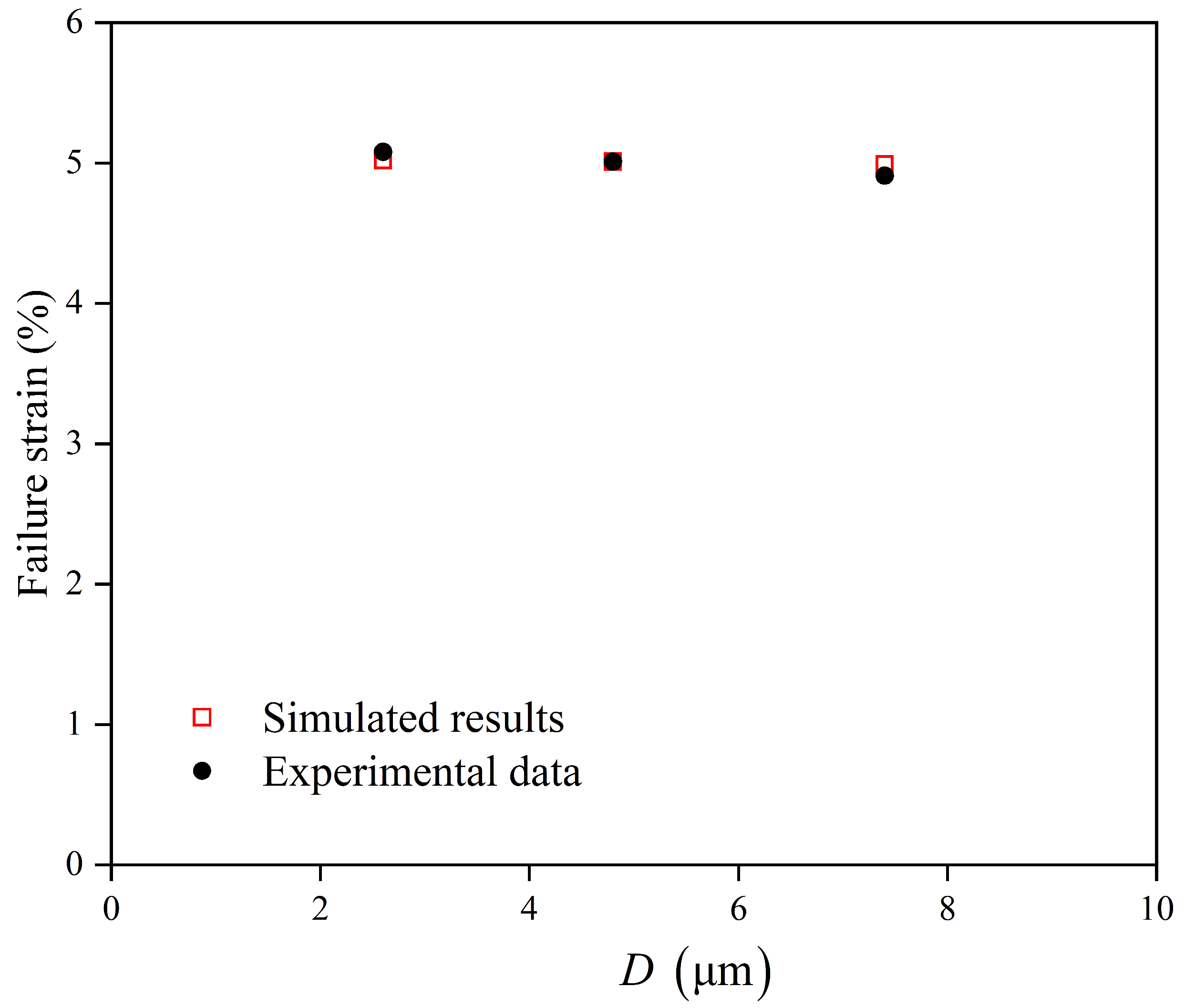 Figure 7. The macroscopic strain required for the local maximum cumulative equivalent plastic strain (PEEQ) to reach the critical value of 5.01%, predicted by finite element simulations for alloys with different grain sizes, and the comparison with the experimental data.