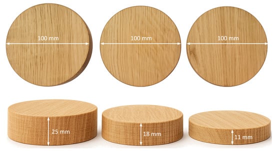 Circular specimens with a diameter of 100 mm were cut from these boards using a computer numerical control (CNC) milling machine to match the inner diameter of the impedance tube used in the measurements, thereby ensuring a perfect fit of the test specimen inside the tube. Using this procedure, ten specimens of each wood type were produced, each with a diameter of 100 mm and thicknesses of 11 mm, 18 mm, and 25 mm. Figure 1 shows the prepared specimens of Sessile Oak.