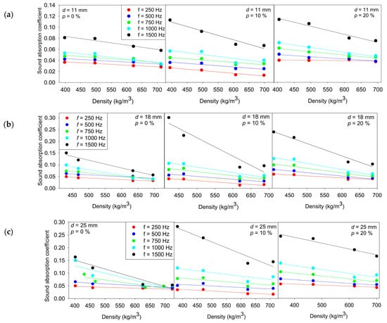 Relationship between the sound absorption coefficient and density for wood of different thicknesses: (a) 11 mm; (b) 18 mm; (c) 25 mm and perforation ratios (0%, 10%, and 20%) at 250 Hz, 500 Hz, 750 Hz, 1000 Hz, and 1500 Hz. Solid lines represent the corresponding linear regression fits for each measurement condition.