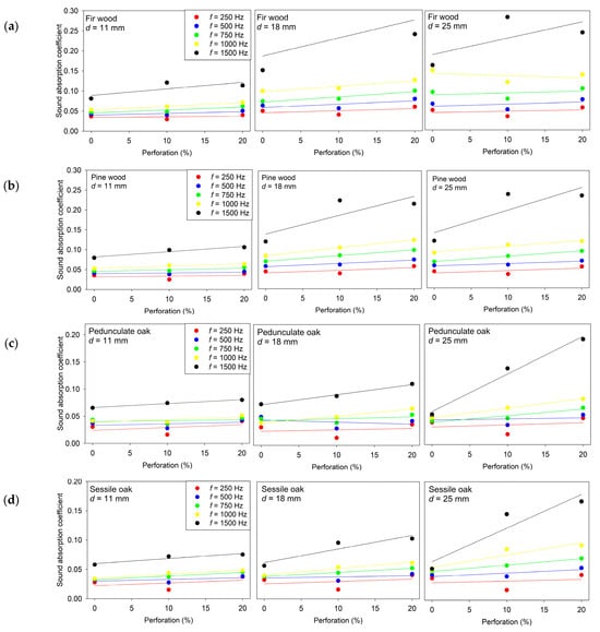 Relationship between the sound absorption coefficient and thickness for wood specimens: (a) Fir wood; (b) Pine wood; (c) Pedunculate oak; (d) Sessile oak with perforation ratios of 0%, 10%, and 20%, measured at 250 Hz, 500 Hz, 750 Hz, 1000 Hz, and 1500 Hz. Solid lines represent the corresponding linear regression fits for each measurement condition.
