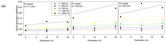 The linear regression coefficients in Table 5 quantify the relationship between perforation ratio and absorption coefficient for each wood type, specimen thickness, and frequency. The relationship between those variables is given by (7), where α denotes the sound absorption coefficient and p represents the perforation percentage.