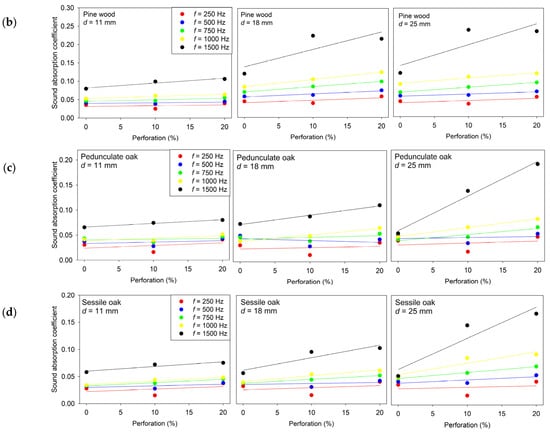 Sound absorption coefficient α as a function of perforation ratio for wooden specimens of different thicknesses measured at 250 Hz, 500 Hz, 750 Hz, 1000 Hz, and 1500 Hz: (a) Fir wood; (b) Pine wood; (c) Pedunculate oak; (d) Sessile oak.
