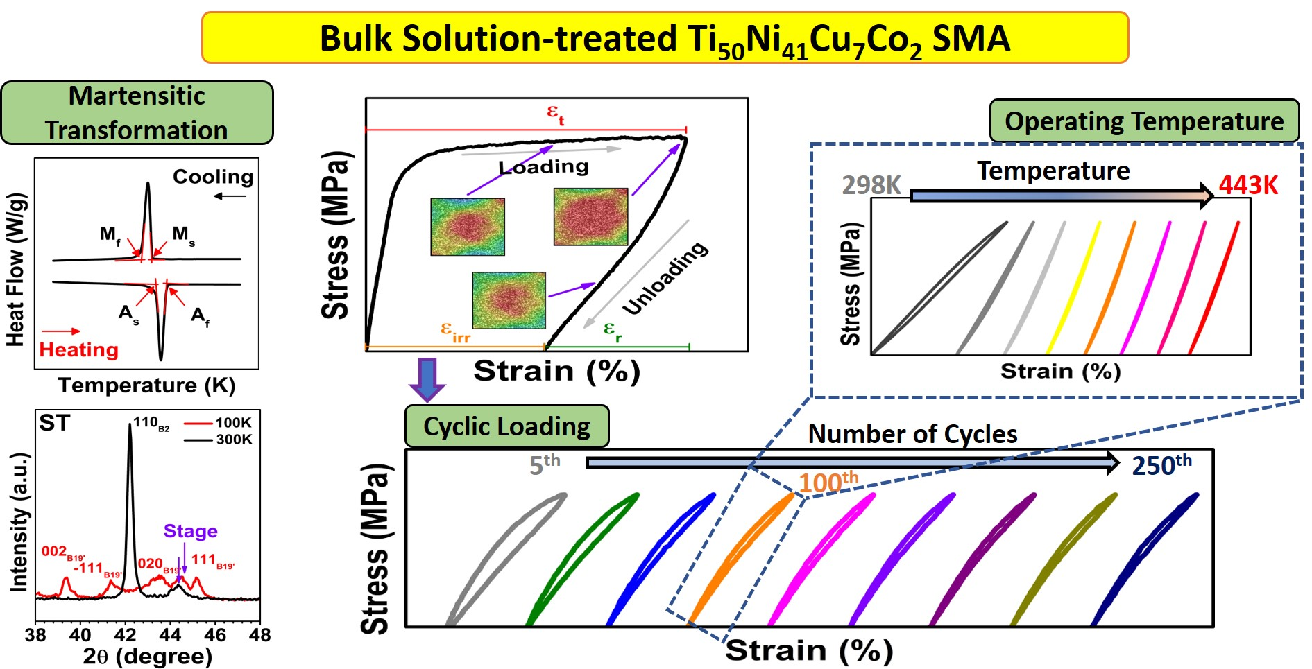 The high irrecoverable strain indicated its lower strength and was prone to plastic deformation, which was undesirable for engineering applications. To achieve practical applications, stable superelasticity and elastocaloric performance were obtained through cyclic tensile stretching to 425 MPa at room temperature.