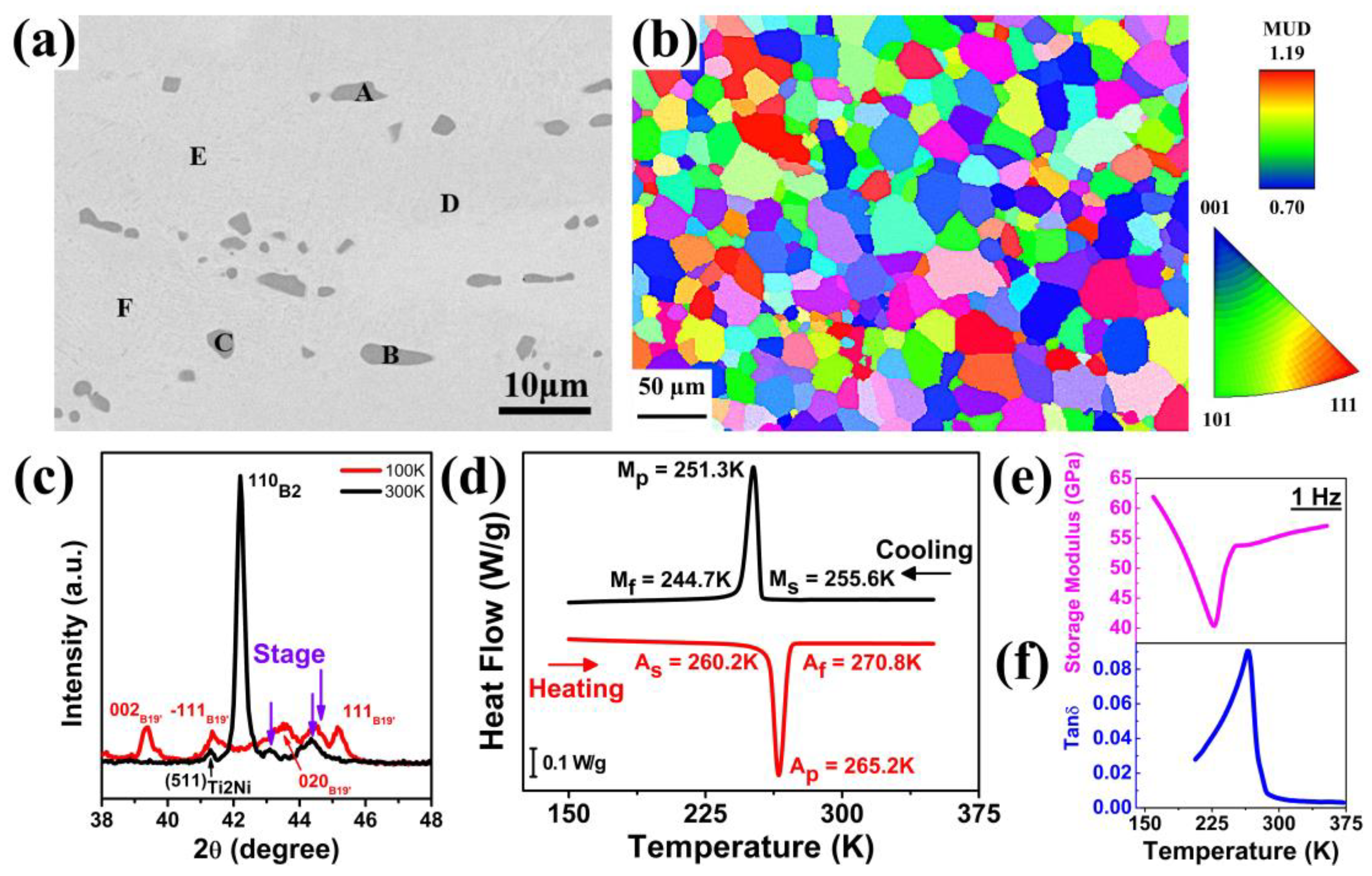 Figure 1e,f, respectively. With a rise in temperature, the storage modulus fell sharply, reaching a minimum at a temperature of 265 K, and then rose steeply. Valley formation at a temperature of 265 K corresponded to the phase transformation (martensite ⇿ austenite). During the phase transformation, the storage modulus softens temporarily due to rearrangements in the crystal structure (coexistence of both martensite and austenite phases). However, tan(δ) increased with temperature, reaching a maximum at a temperature of 266 K, and then fell sharply, forming a peak at a temperature of 266 K. The peak formation also confirmed the phase transformation within the material, as this peak formation showed more internal friction generation, mainly due to interface movement during the phase transformation. The thermal analyses by DSC and DMA showed that the crystal structure transformed with temperature, which was a characteristic of SMAs.