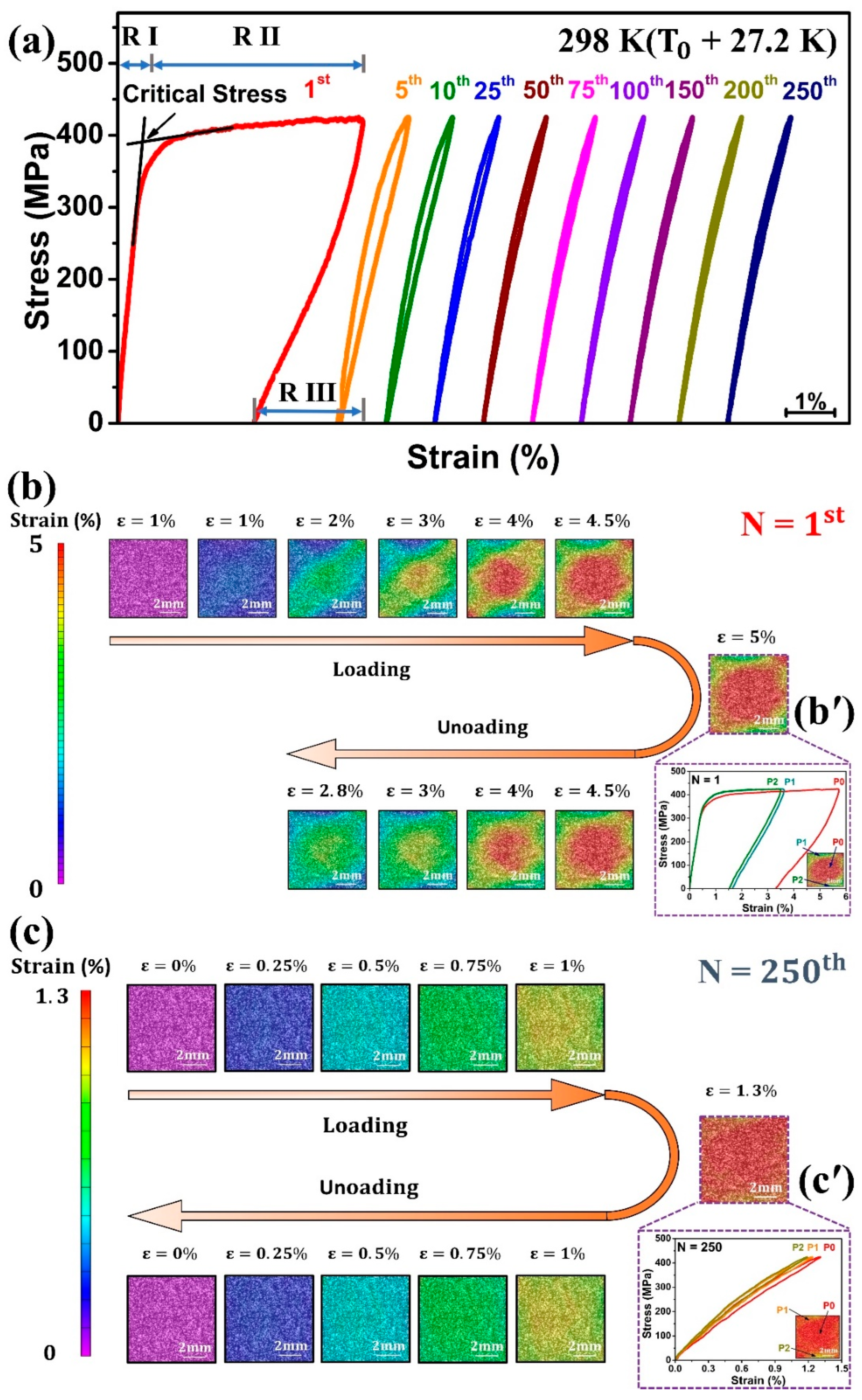 Figure 3c’. It can be seen that when P0 reached the maximum strain of 1.31%, P1 was 1.24% and P2 was 1.19%, indicating that the defects or dislocations generated during previous cycles promote the homogeneous martensitic phase transformation [