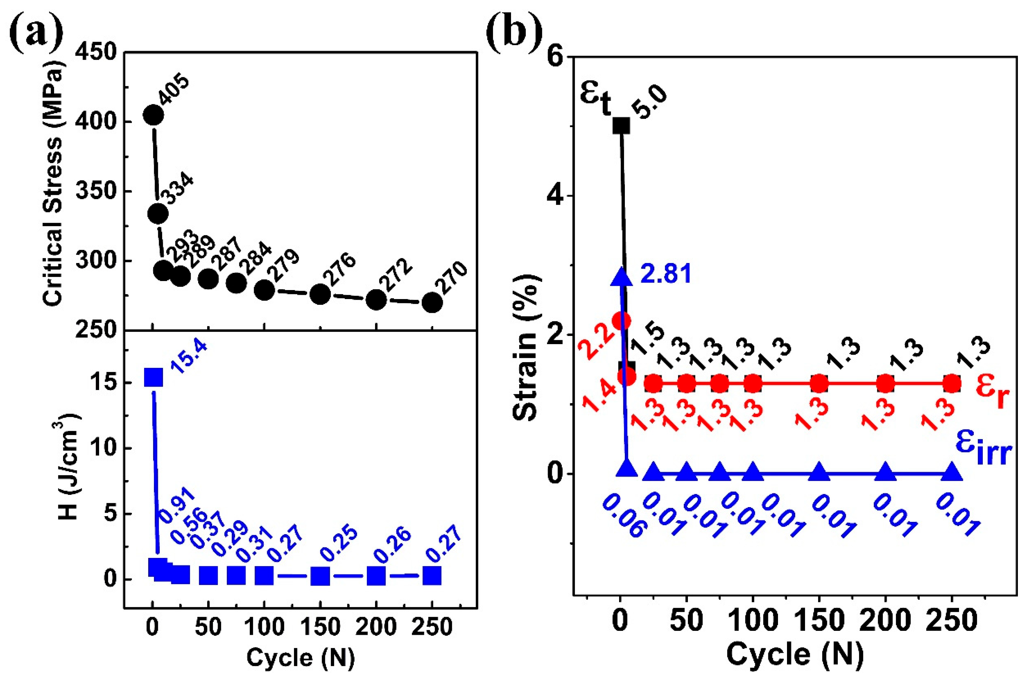 irr) became 1.3% and 0.01%, respectively. After the 25th cycle, irrecoverable strain became negligible (0.01%), and the recoverable strain (ε