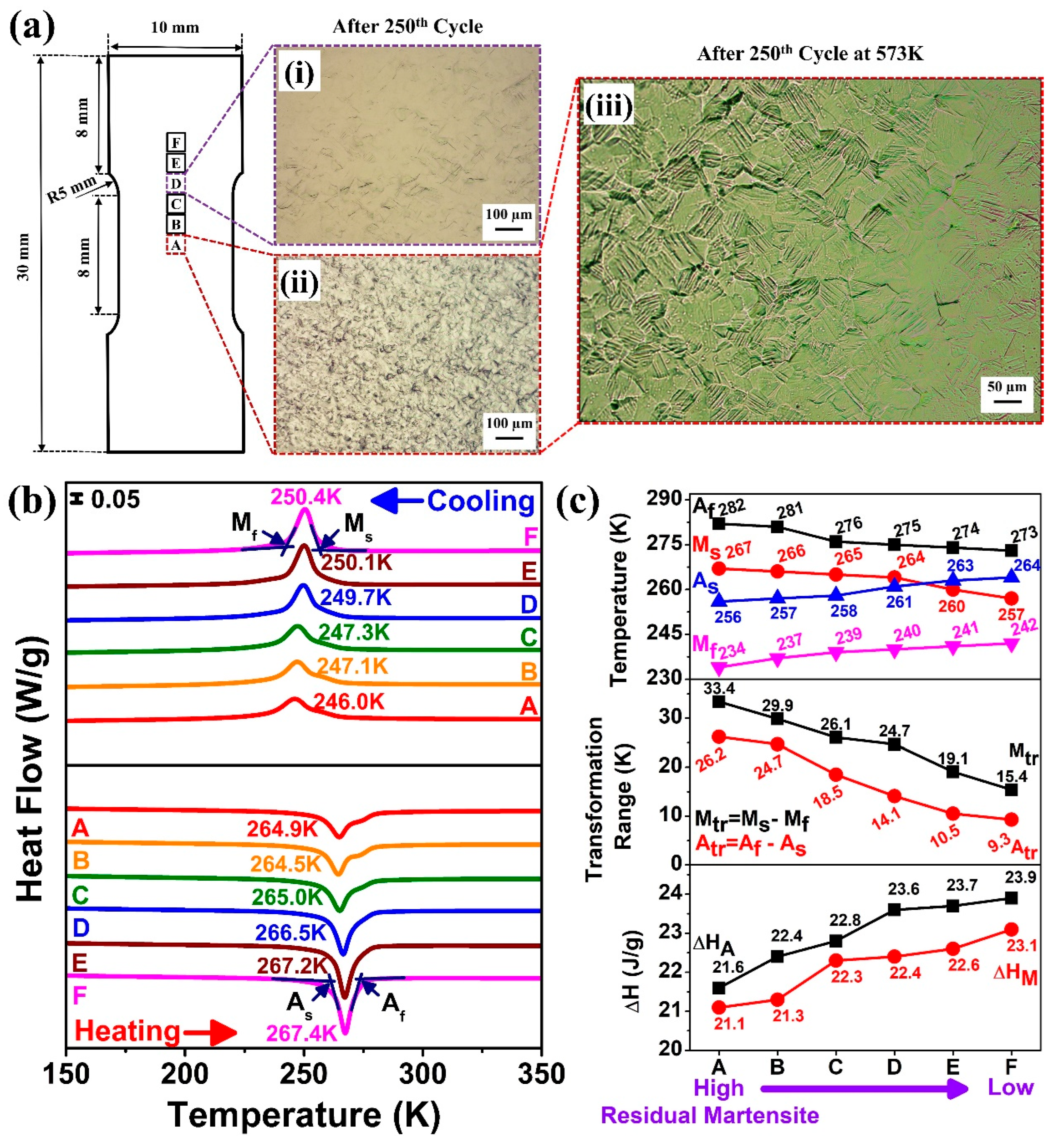 Figure 6c summarizes the phase transition temperatures across regions A–F. As moved from region F to A (increasing residual martensite), M