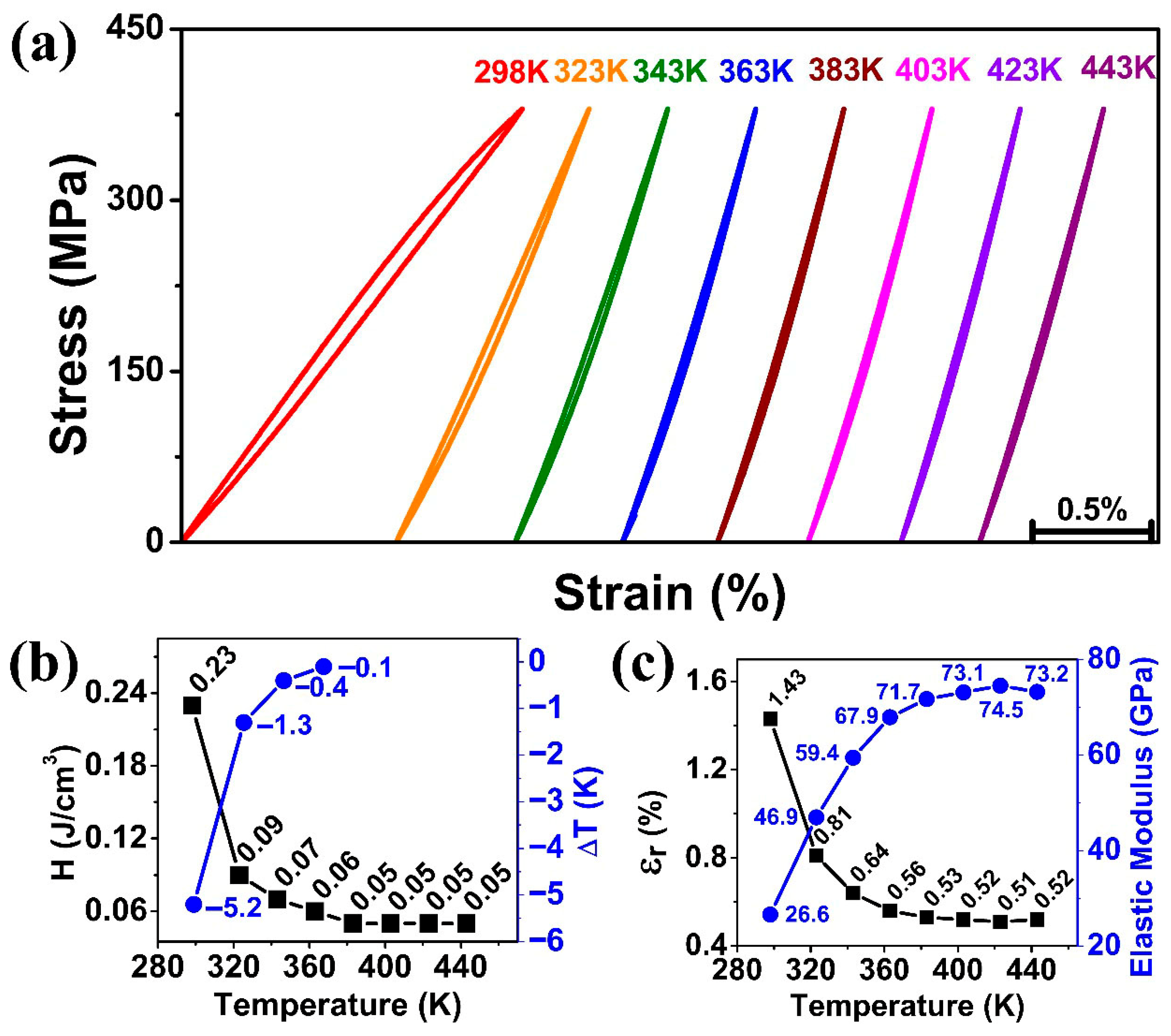 Figure 7 shows the effect of operating temperature on superelasticity and elastocaloric effect tested between 298 K and 443 K. Under the maximum stress of 425 MPa, the stress–strain curves remained linear for all temperatures, as shown in