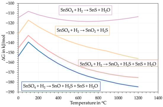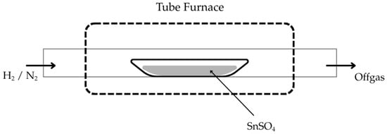 Prior to the experimental trials, the thermochemical modelling software FactSage 8.3 (GTT Technologies, Herzogenrath, Germany) was used to conduct preliminary feasibility calculations of the reaction between SnSO4 and H2, as well as the possible product formation. Furthermore, the thermal decomposition of SnSO4 under inert atmosphere was investigated using DSC analysis (Netzsch STA 449F3, Netzsch Group, Selb, Germany) to confirm endotherm/exothermic events, as well as to understand possible side reactions happening to the decomposed product inside the heated tube furnace. This study was conducted under Ar atmosphere from 25 °C to 800 °C at heating rates of 2 K/min and 10 K/min. This is deemed necessary, as the precursor solution will pass through a heated tube furnace, where both the hydrogen reduction and the thermal decomposition could take place.