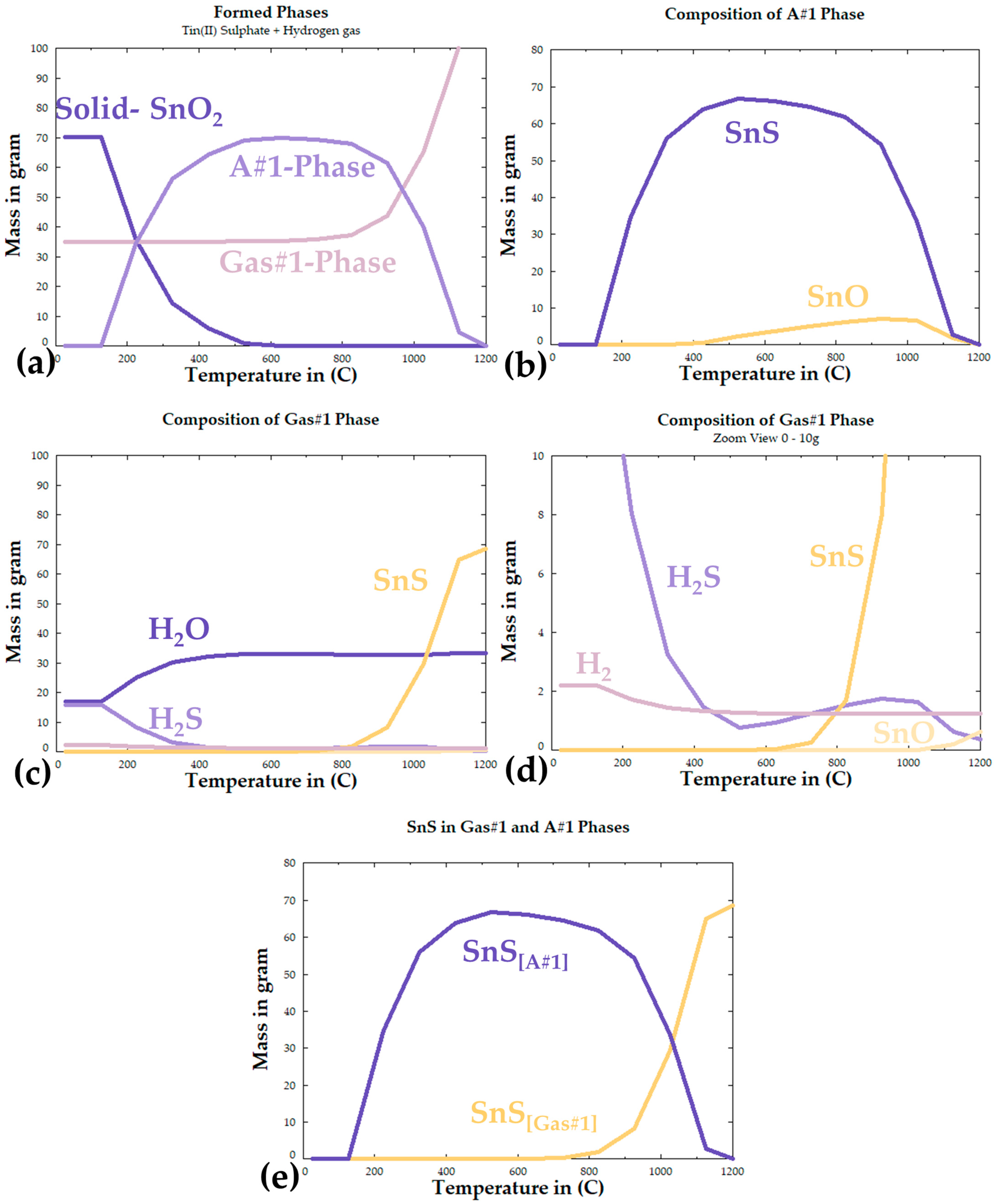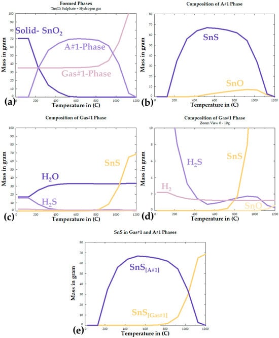 FactSage calculated reaction products: (a) total formed phases, (b) composition of A#1 phase, (c) composition of Gas#1 phase, (d) zoomed view of Gas# 1phase composition, (e) overall formation of SnS in both phases.